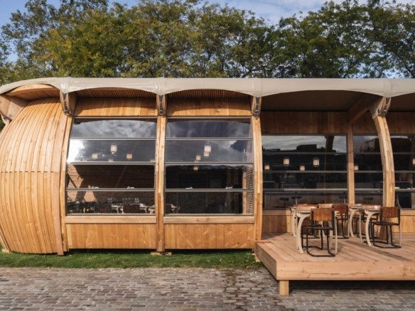Restaurant en bois et en verre posé sur une pelouse au bord...