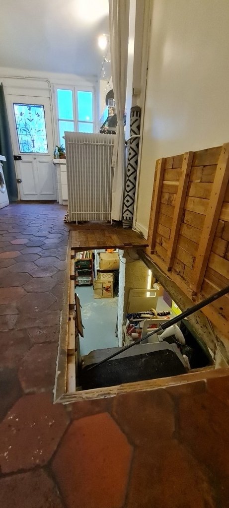 - Cave bétonnée accessible par une trappe (type restaurant) depuis le salon.