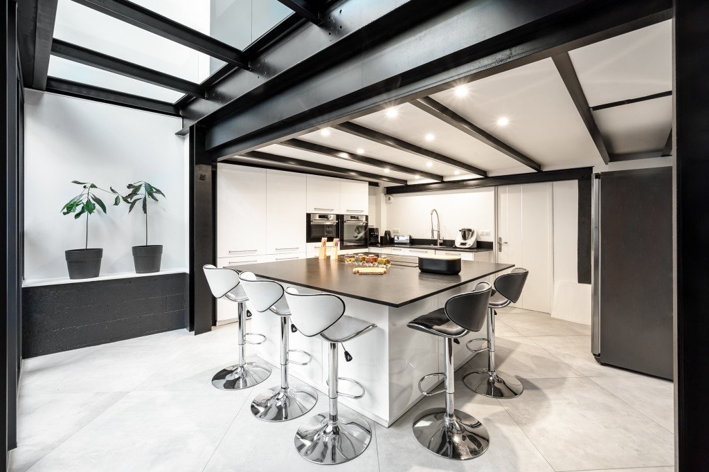 - bel espace de vie avec un salon/salle à manger et une cuisine ouverte (110 m²) qui donne directement sur le patio (18m2), et la verrière de 7 mètres de haut (stores motorisés)
