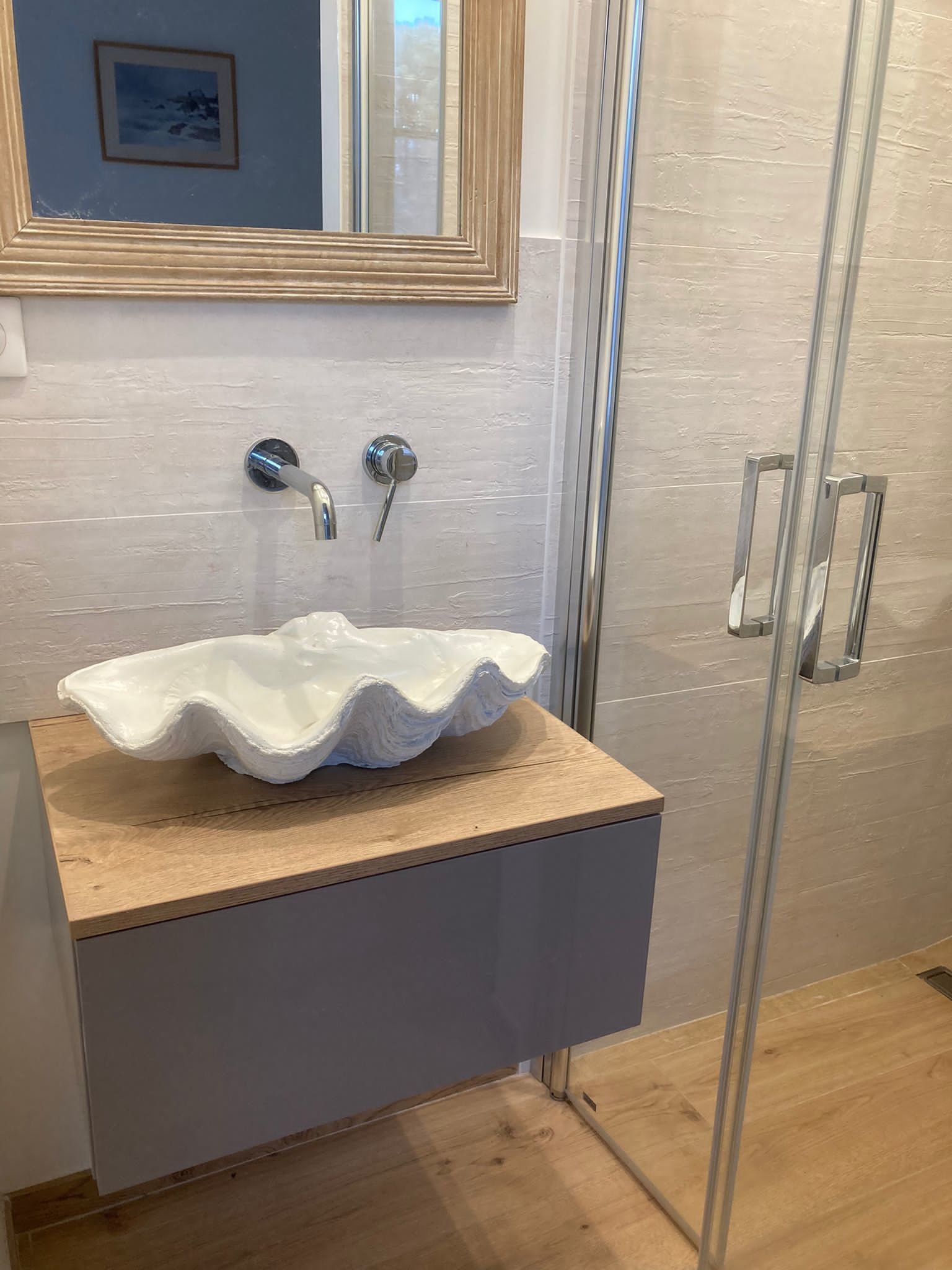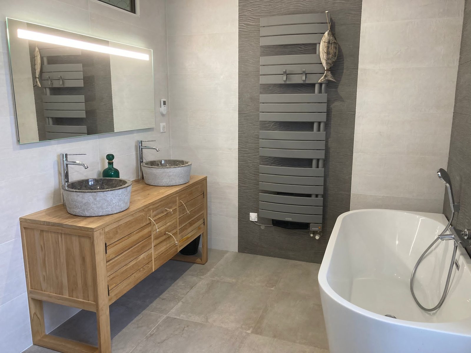- une salle de bain avec baignoire semi-îlot et WC indépendant avec lave mains