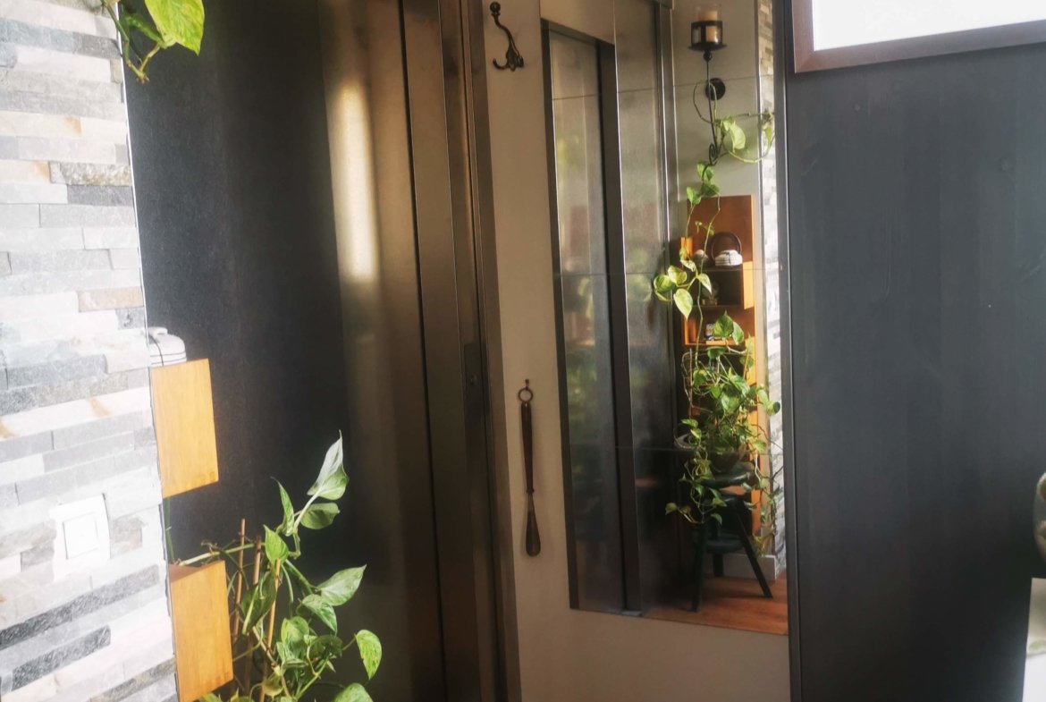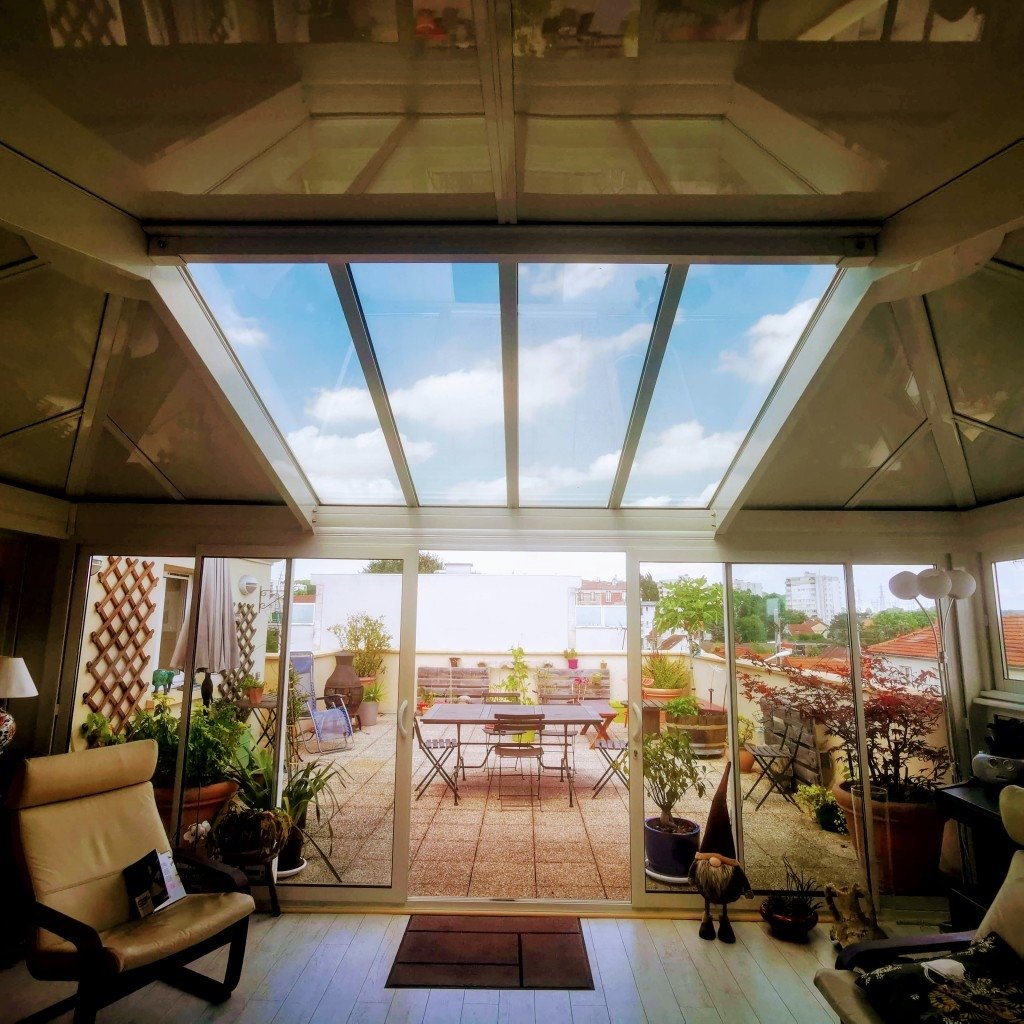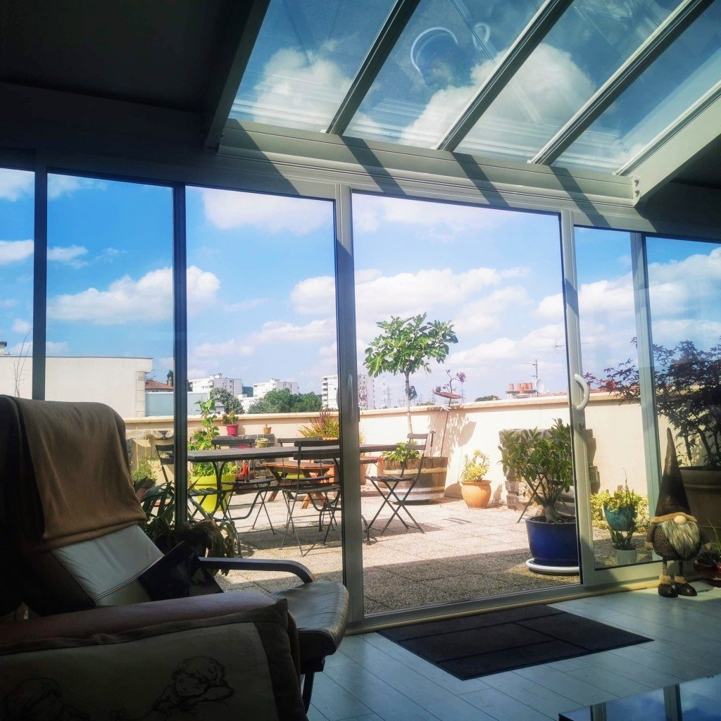 - une pièce commune : cuisine, salle à manger donnant dans une véranda/salon de 25 M2 (hauteur de plafond 2'70) qui est contiguë à une terrasse de 55 M2 sans vis-a-vis.
