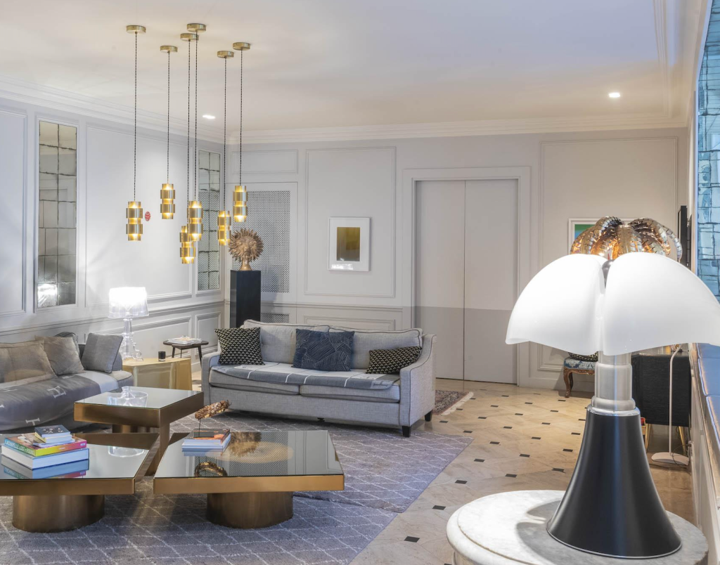 Volumes traversants, boiseries d’époque, marbre noir, porphyre, albâtre, bronzes dorés, mobilier design déplaçable, œuvres fortes : chaque pièce est un décor. Lumière naturelle stable, textures haut de gamme, espaces.