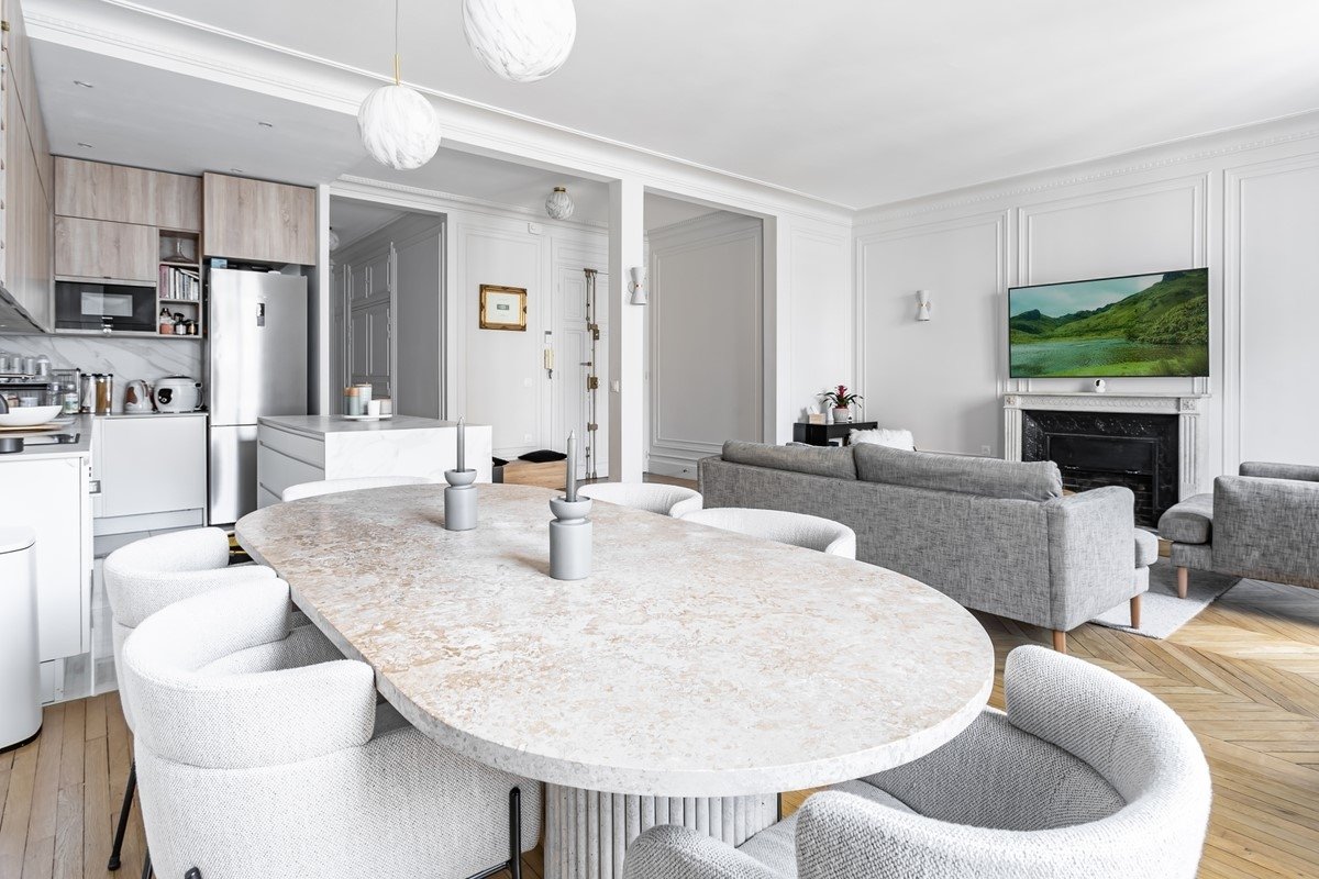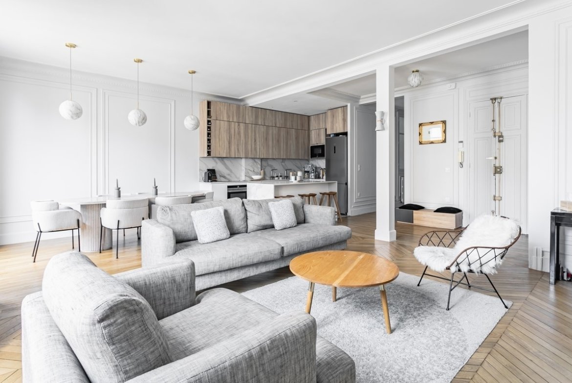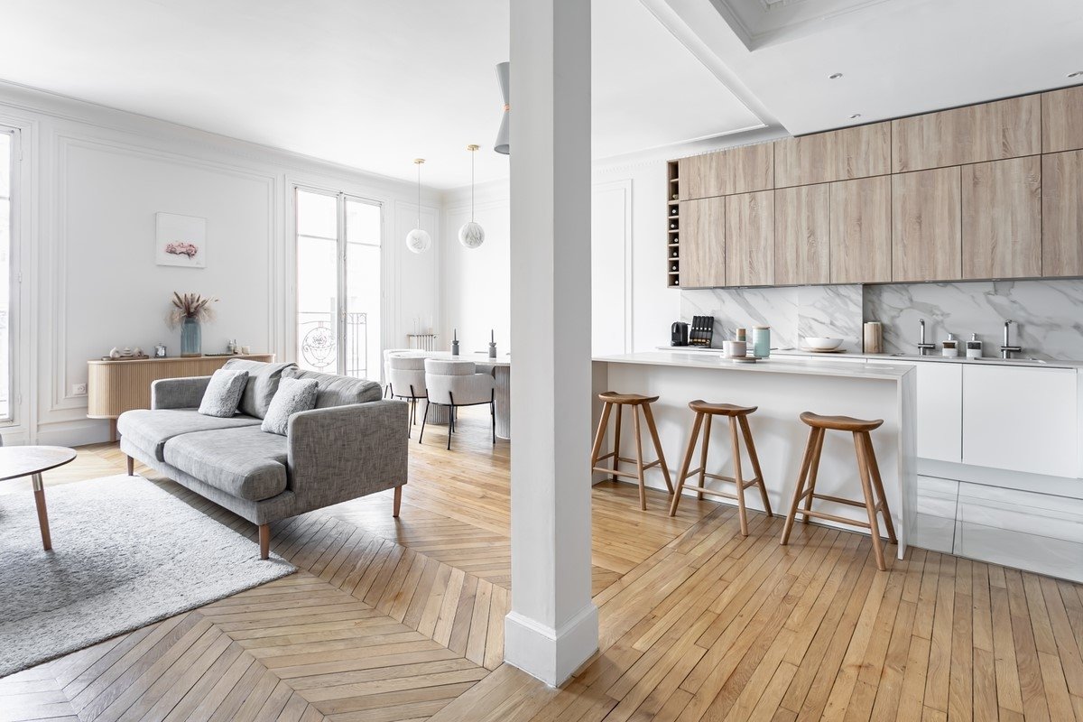 Un séjour d’environ 40m2 épuré avec cuisine américaine et Ilot central/bar