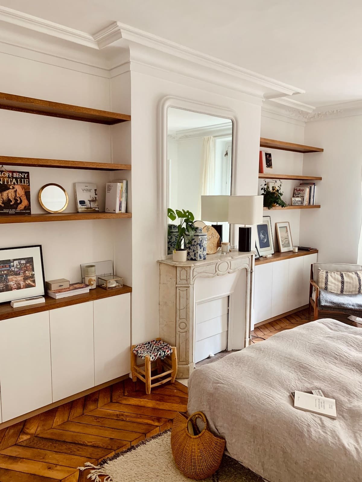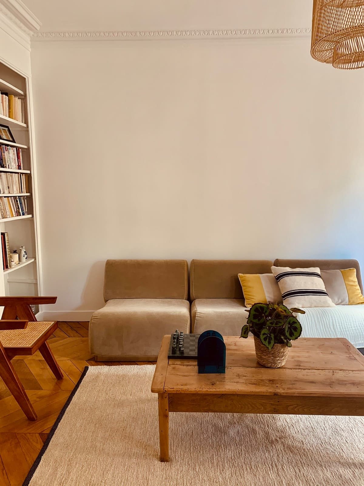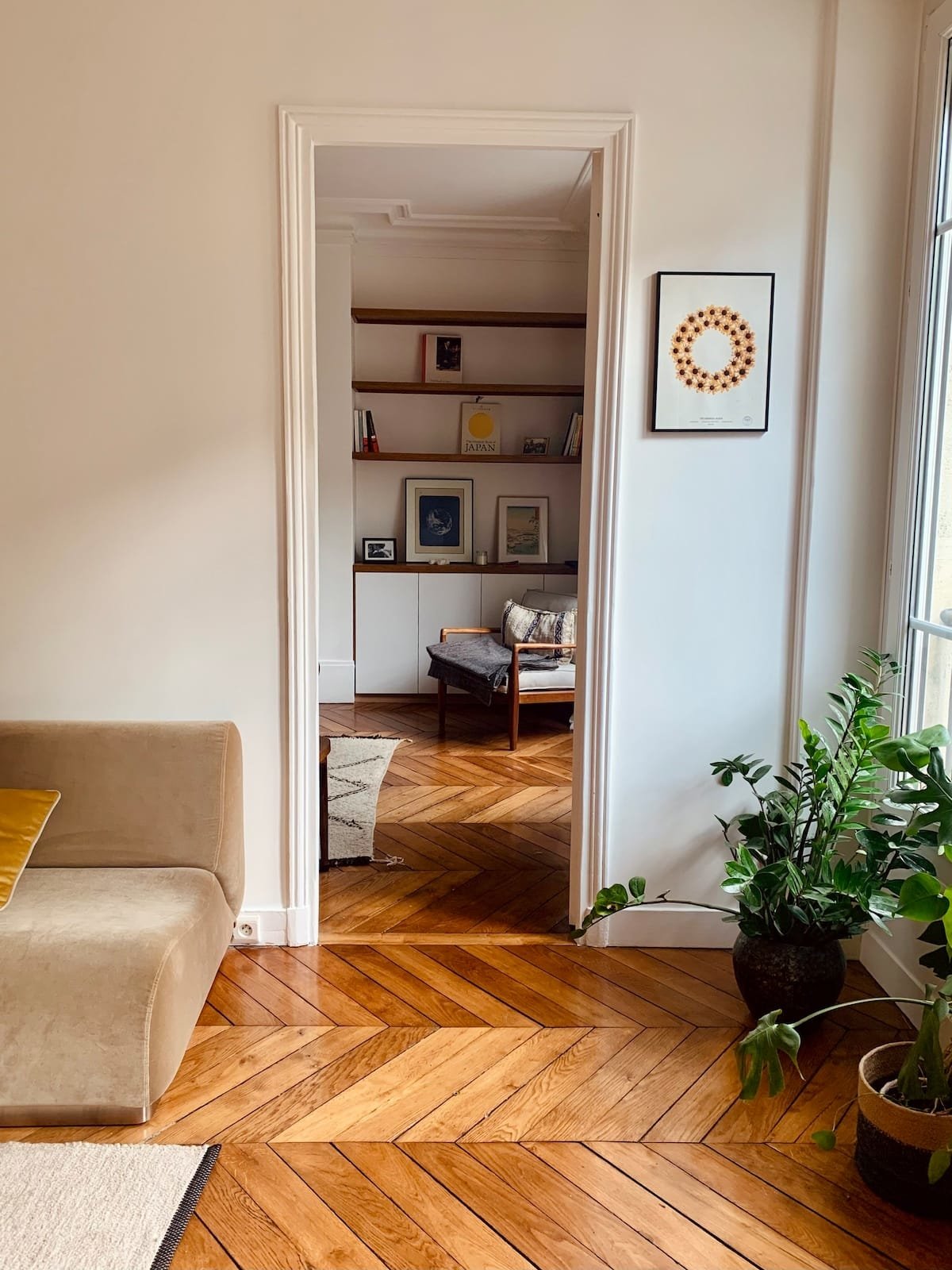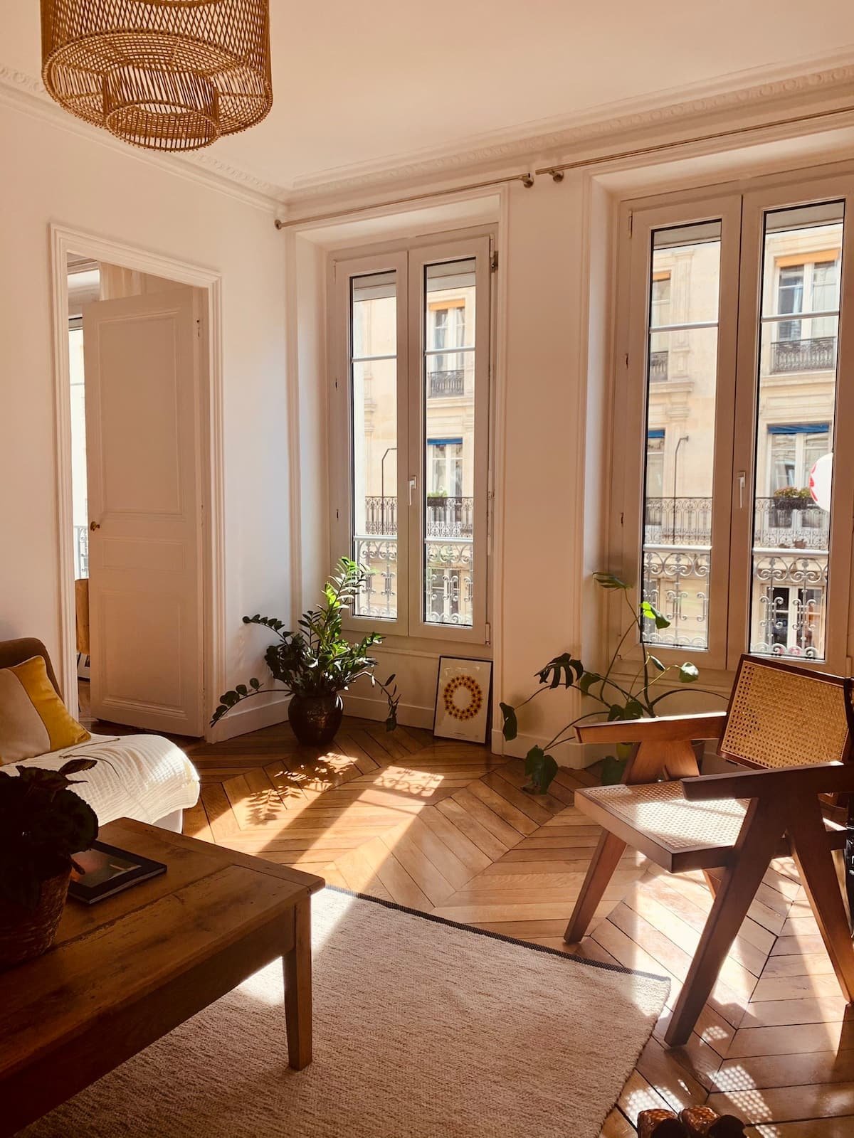 Appartement typique parisien : lumineux, haut de plafond, parquet à chevron/point de Hongrie, jolies moulures et cheminée dans la chambre principale et dans le salon.