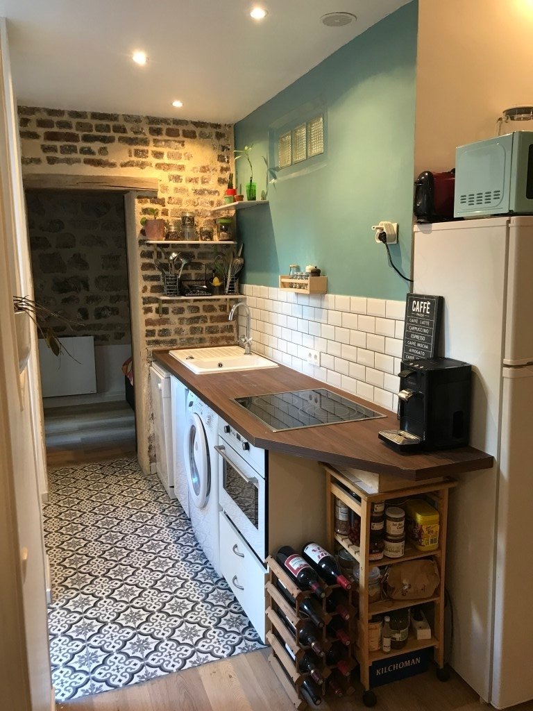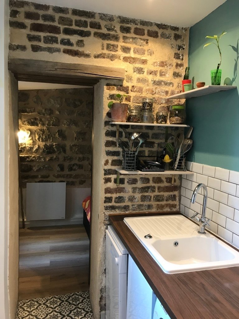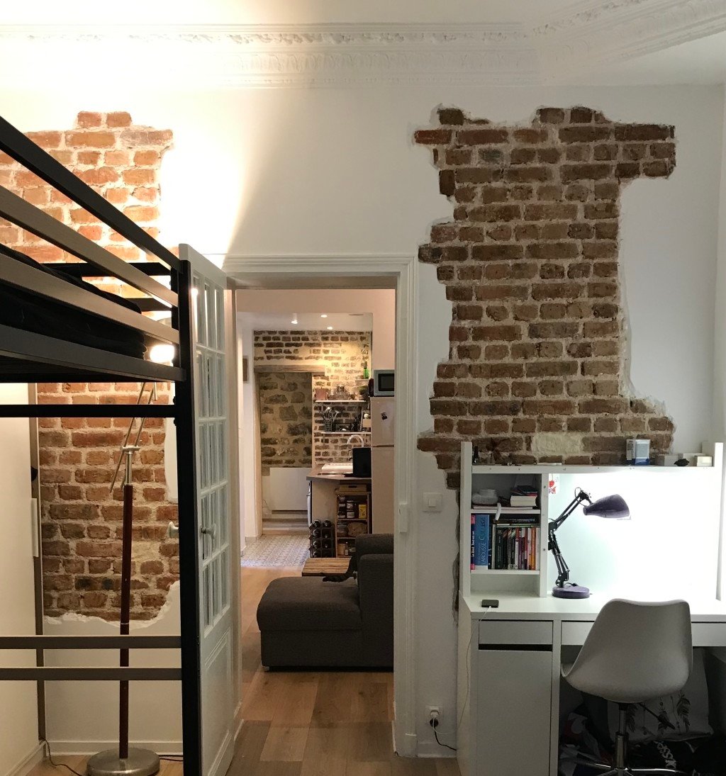 - briques apparentes dans la grande chambre, ainsi que dans la cuisine.