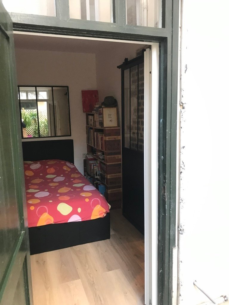 Le cabanon, anciennement local à vélos, a été annexé, une ouverture a été créée, pour en faire une petite chambre particulièrement atypique avec ses pierres et briques apparentes, son plafond oblique et surtout son ouverture sur la cour privative avec la porte d’origine .