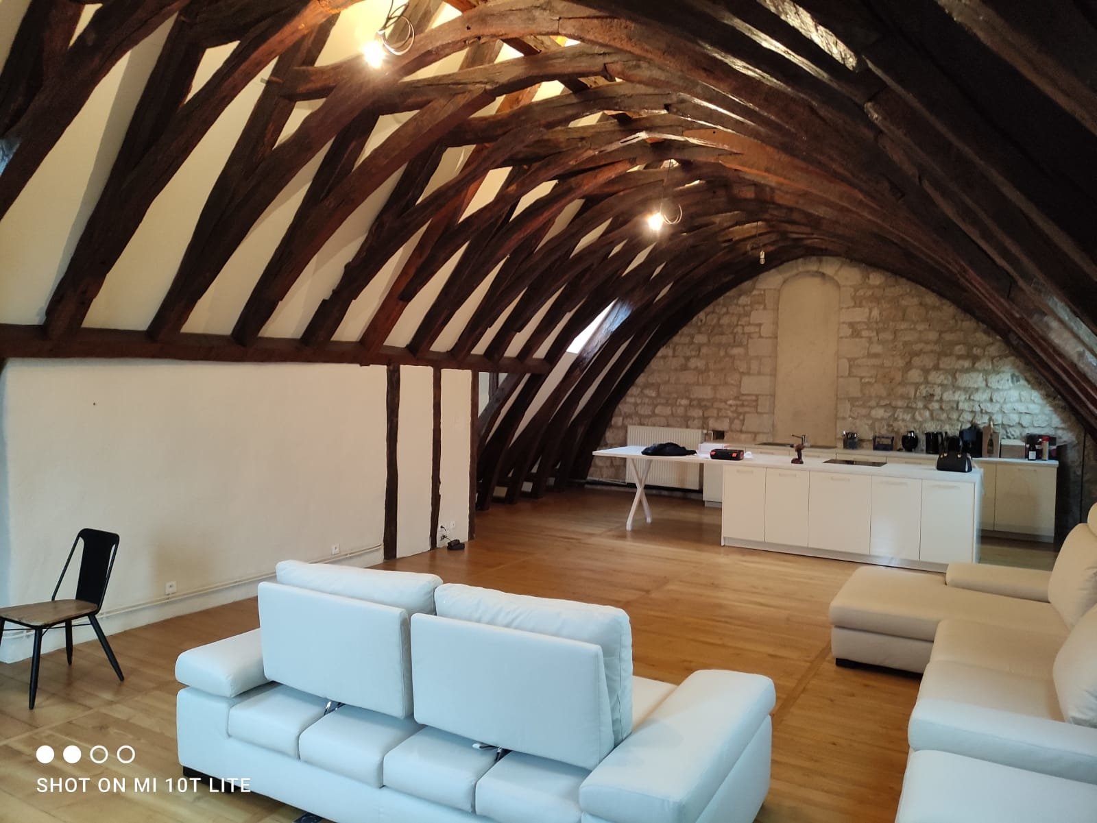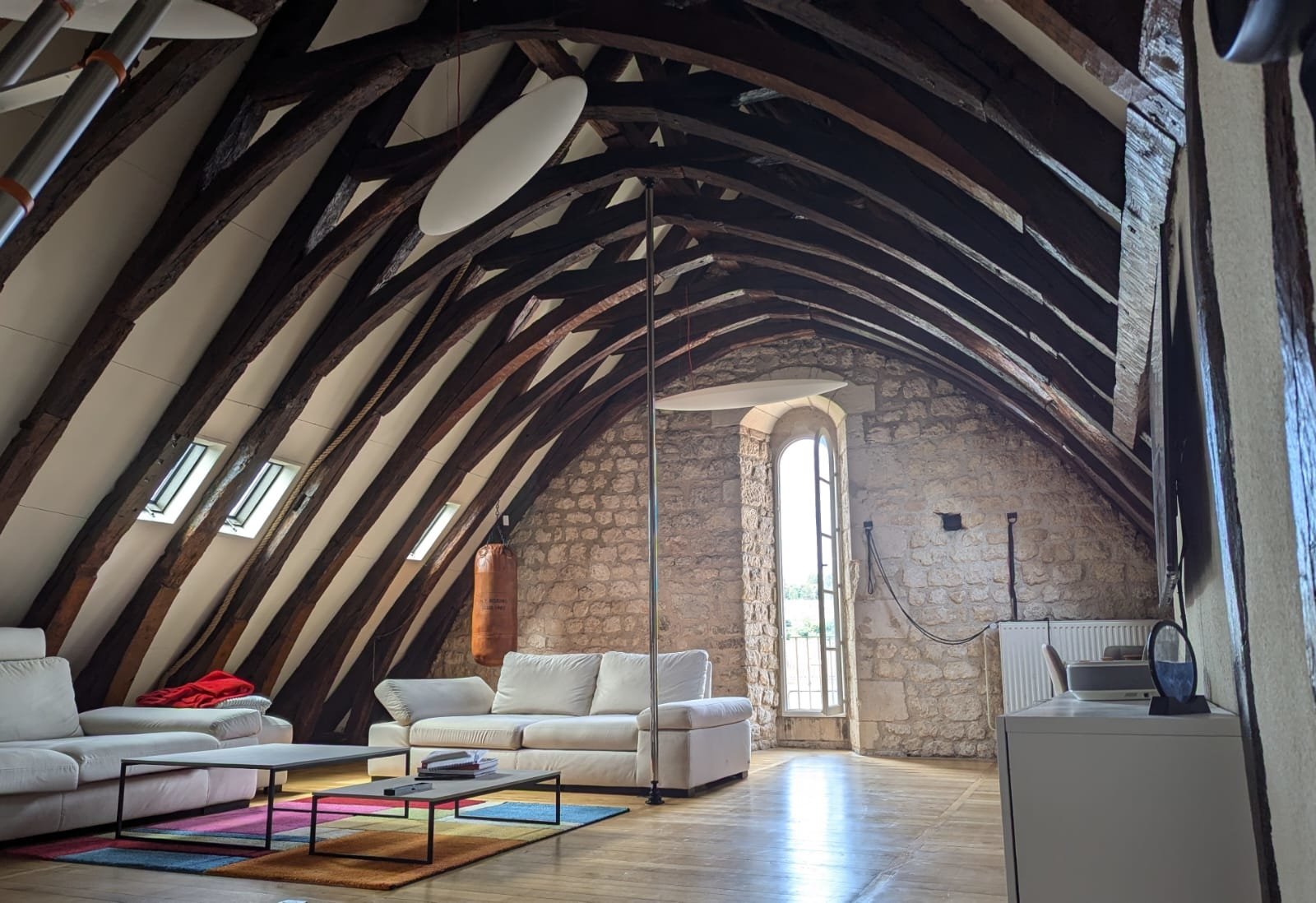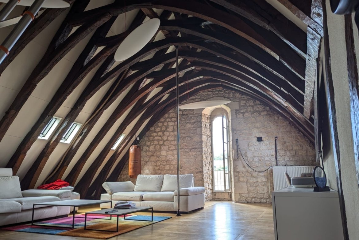 Ancien atelier des compagnons de France, l appartement comporte un salon de 120m2 lumineux, avec murs en pierres apparentes et charpente massive en coque de bateau inversée.