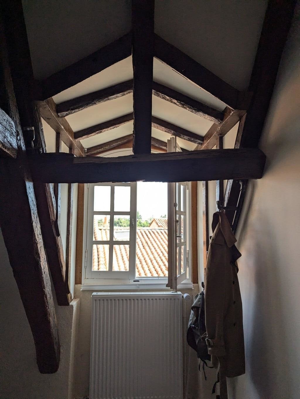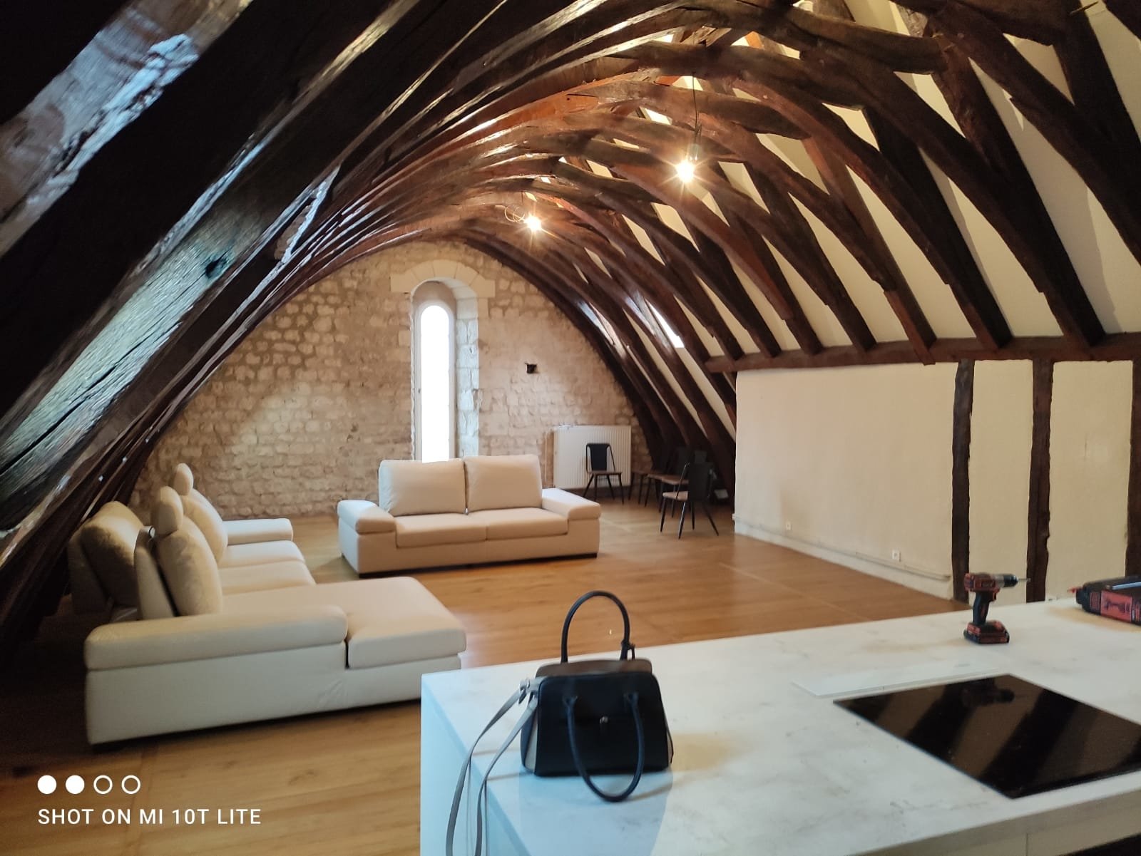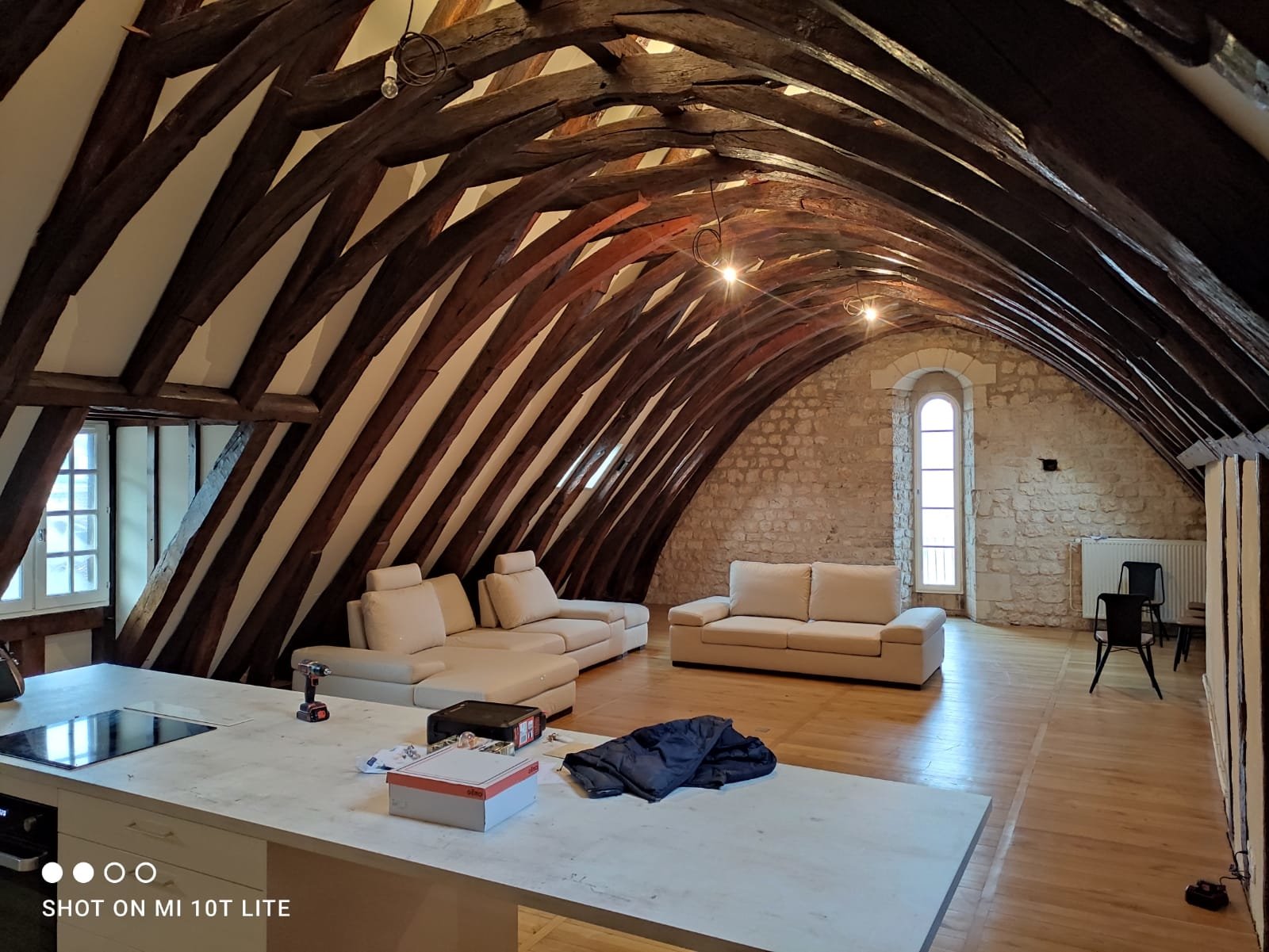 Ancien atelier des compagnons de France, l appartement comporte un salon de 120m2 lumineux, avec murs en pierres apparentes et charpente massive en coque de bateau inversée.