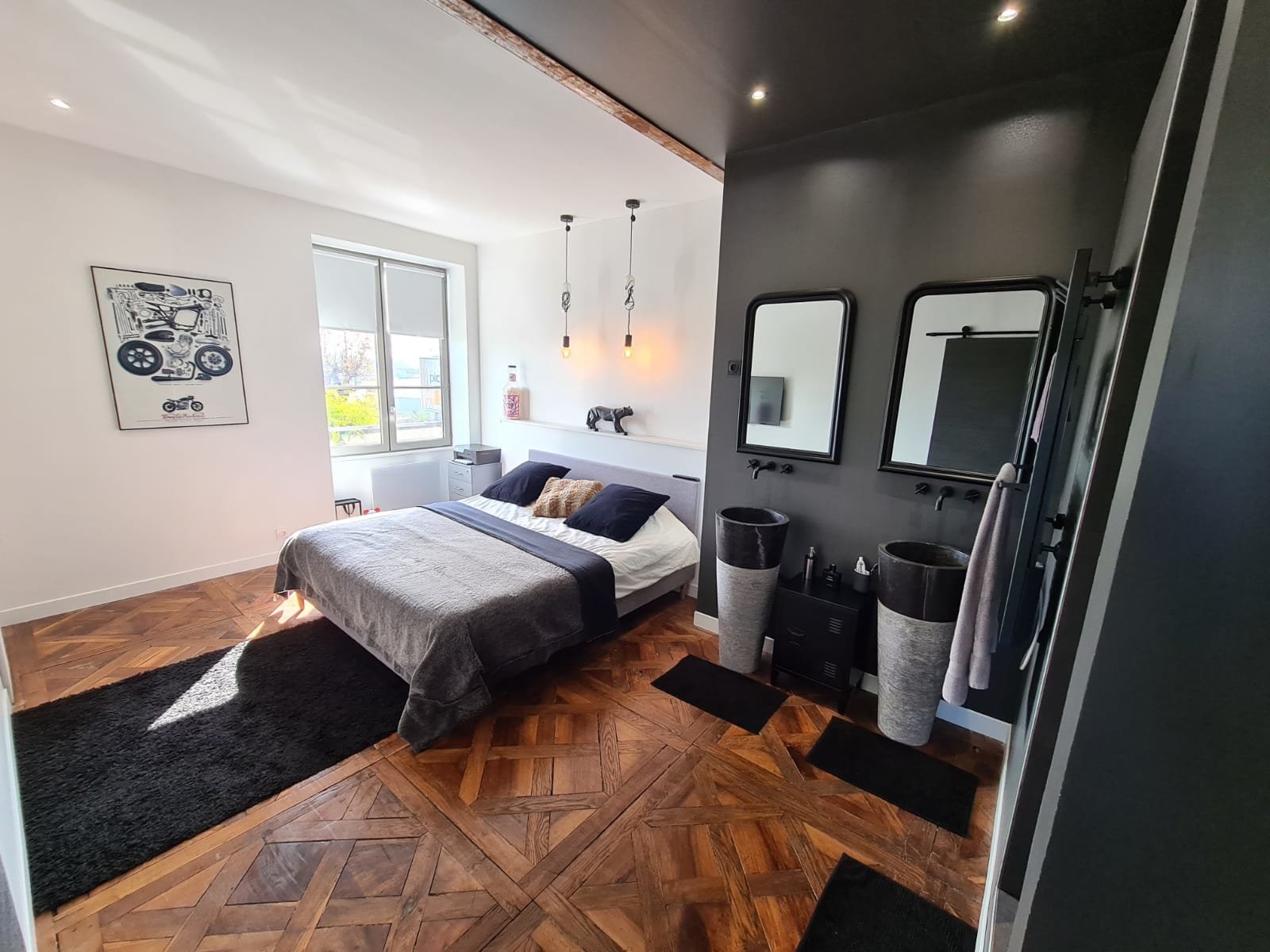 - chambre avec salle de bain, douche et vasques ouvertes sur la pièce