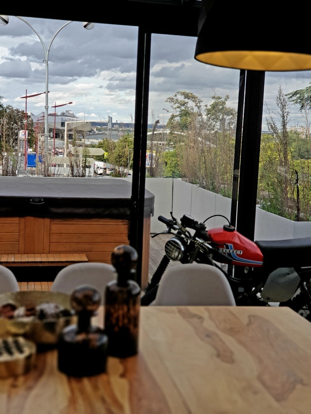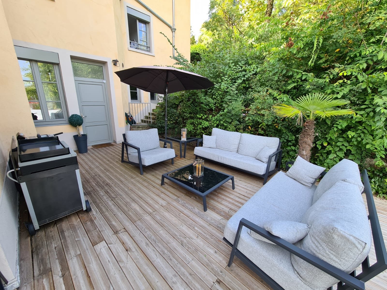 Terrasse de 100 m² avec un coin salon de jardin/cuisine d'été et un coin jacuzzi chaises longues.
