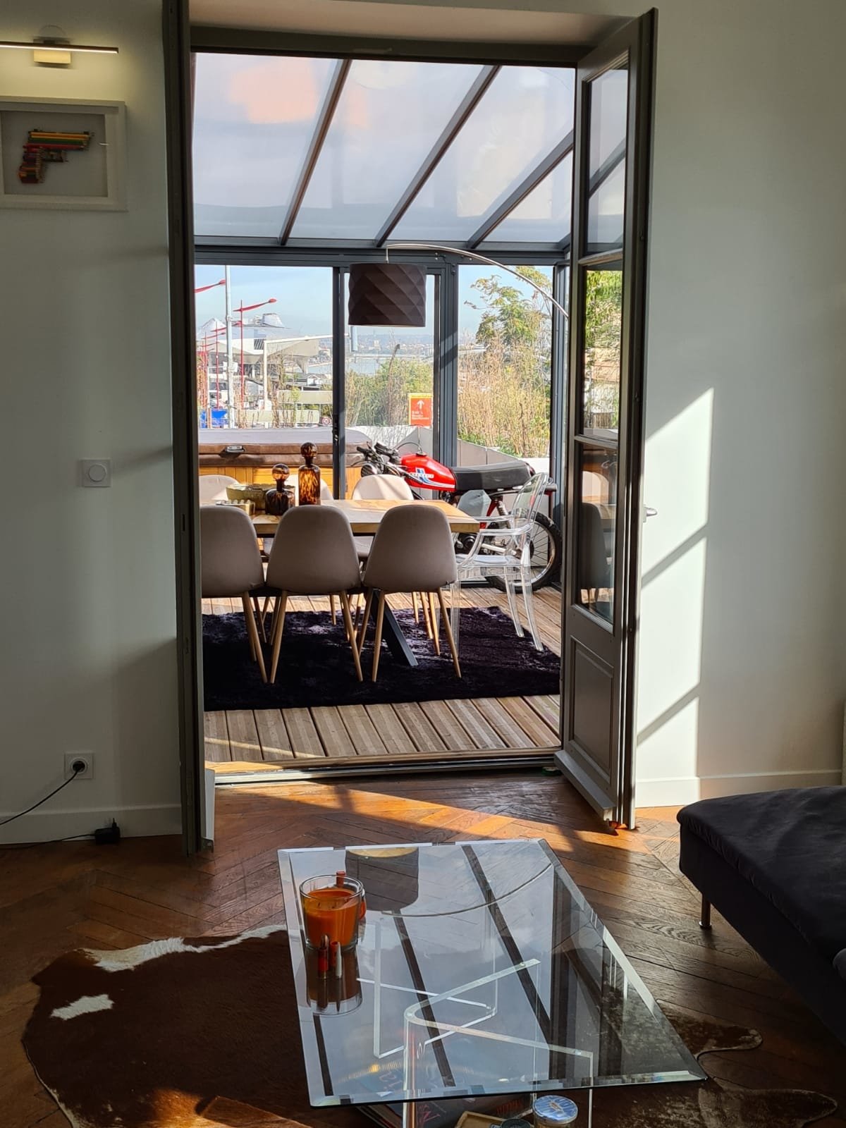 Jardin d'hiver sur la terrasse (véranda) avec table à manger.