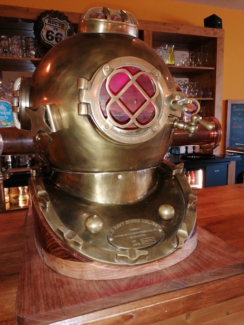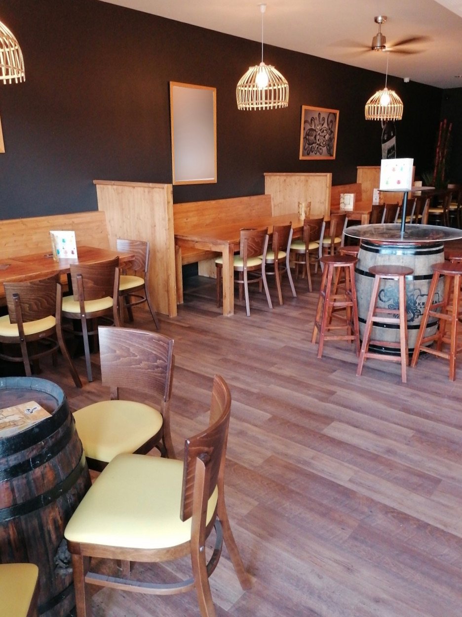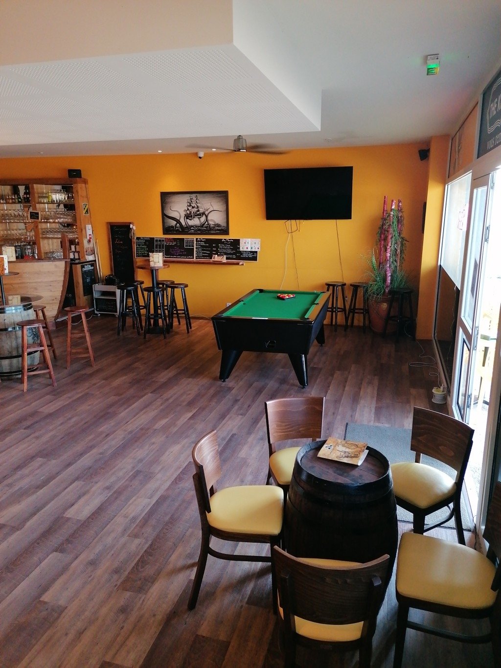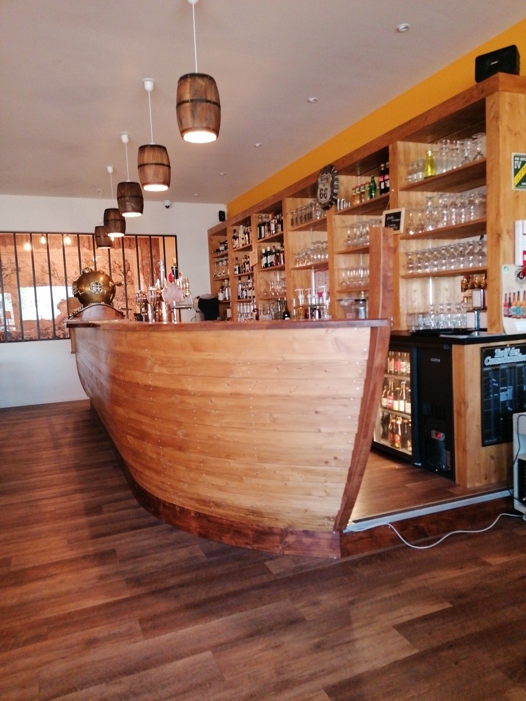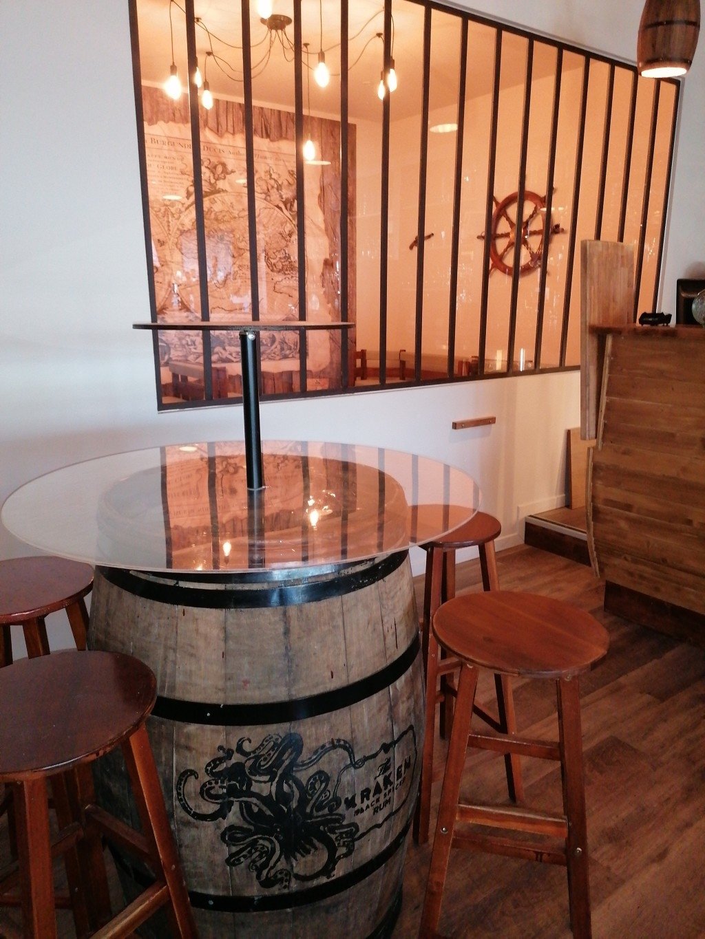Ce bar est unique : demi-coque de bateau, tonneau à l'effigie du kraken avec parquet flottant au sol