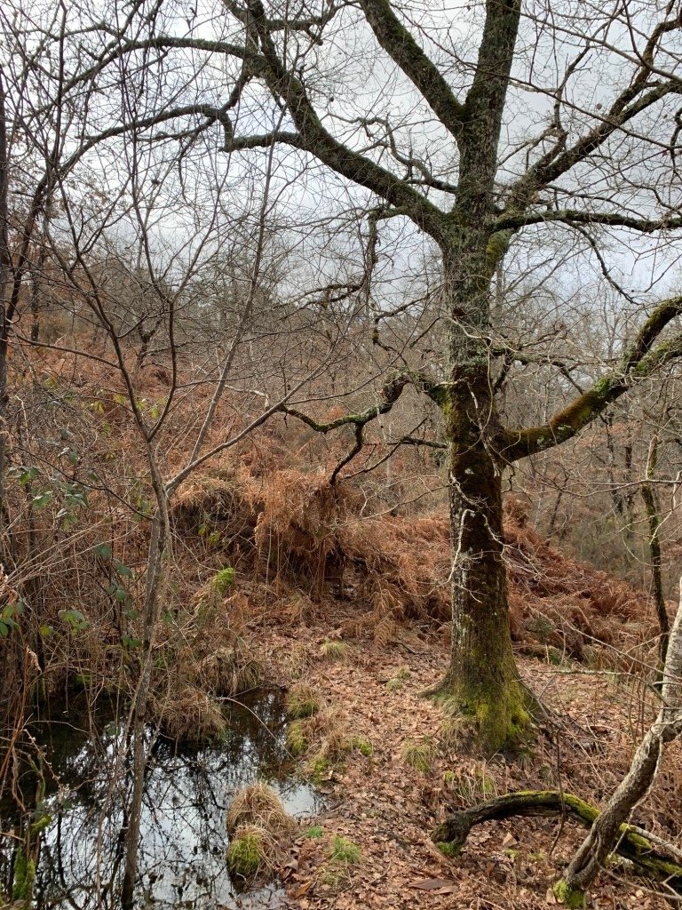 Présence de feuillus, résineux et d'un ruisseau.