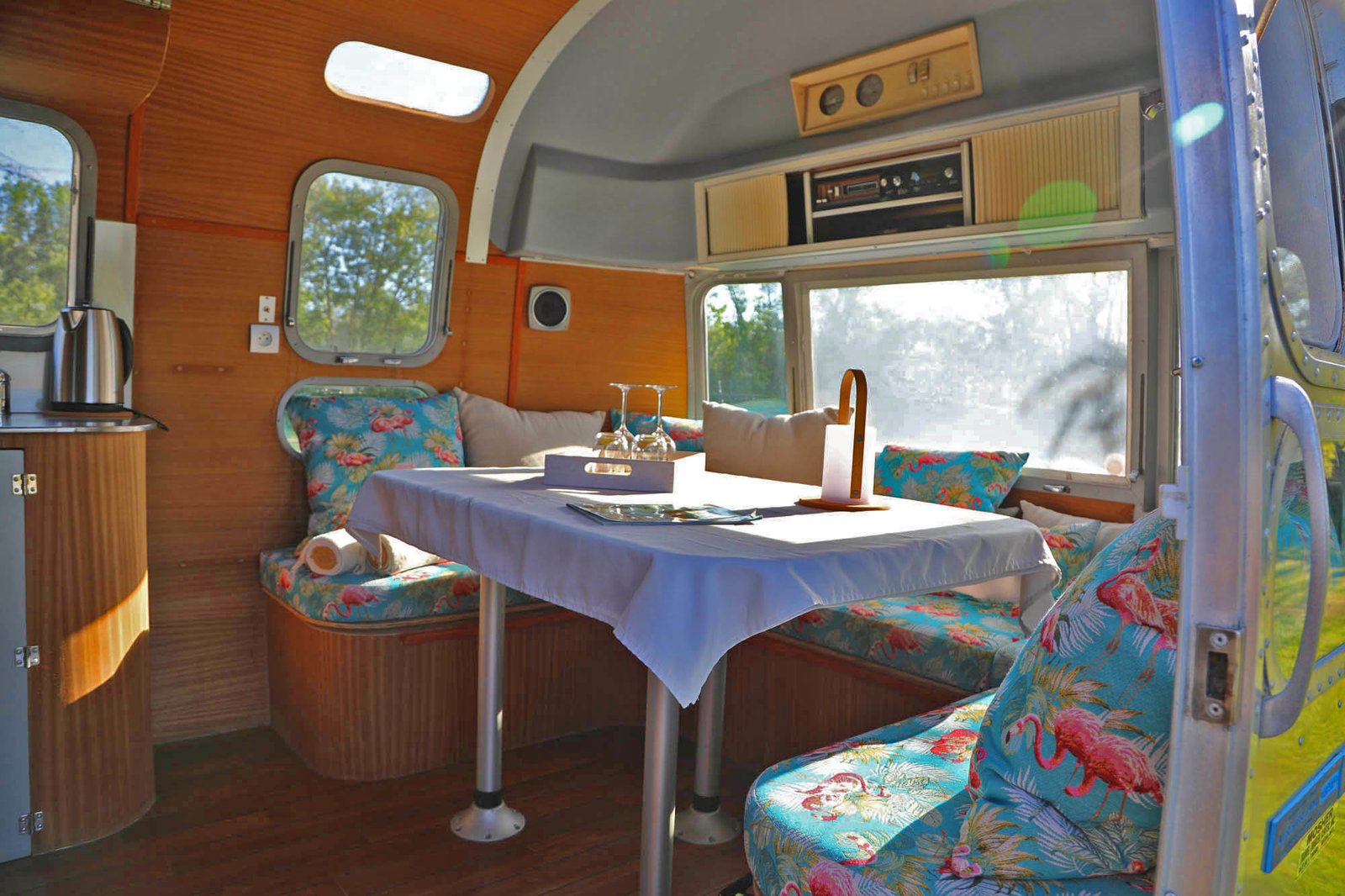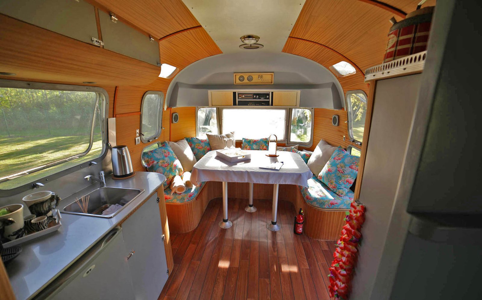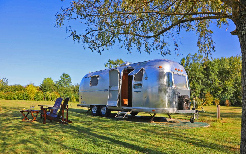 Caravane Américaine AIRSTREAM des années 1970 posée au bord d'un lac dans une ambiance champêtre. Terrain clos de 5000 M² environ.