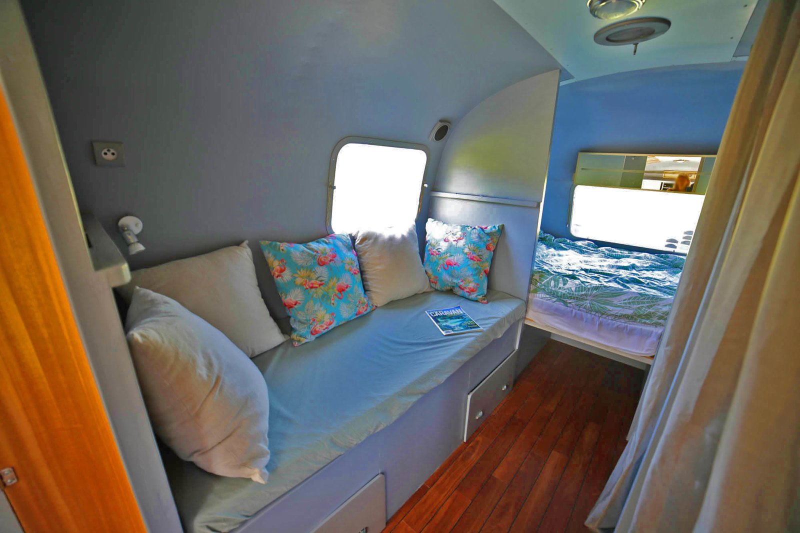 Elle est composée d'un coin salon diner pour 4 personnes, d'un espace cuisine avec frigo, d'un lit double 160 x 200 cm + un lit 90 cm. A quelques mètres, une annexe en bois abrite une salle d'eau et WC privatifs.