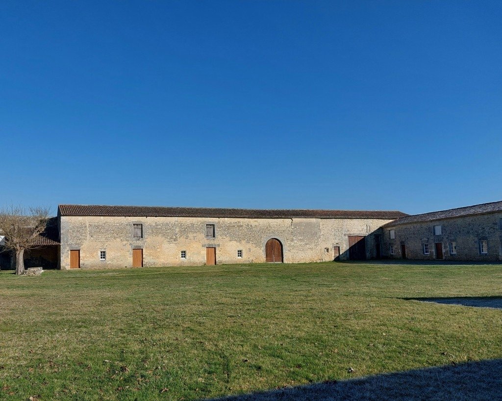 Un porche charentais fermant le domaine composé du château, d'écuries et de granges, d'un parc arboré avec allées cavalières , d'un canal et d'un lavoir du 17ème. Puits devant une enfilade de colonnes du 18ème siècle. Les façades sont exposées aux 4 coins cardinaux . Eglise romane à proximité. Un jardin fleuri plein Sud.