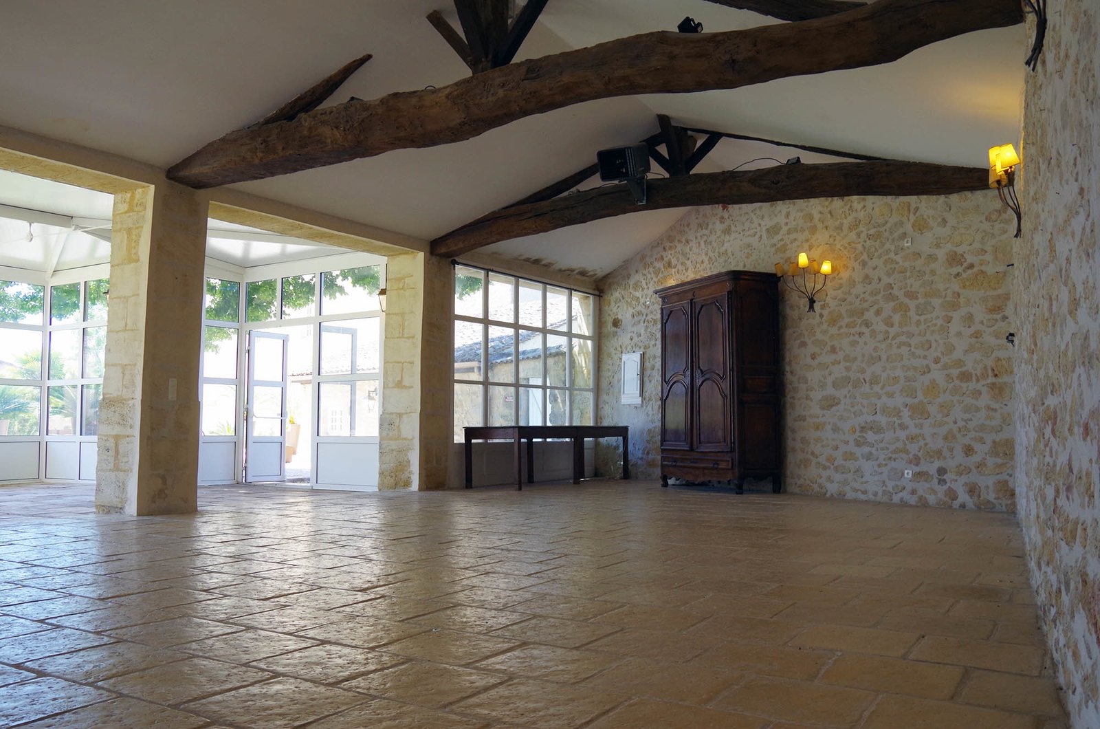 Cette grande salle de réception et son immense baie vitrée.