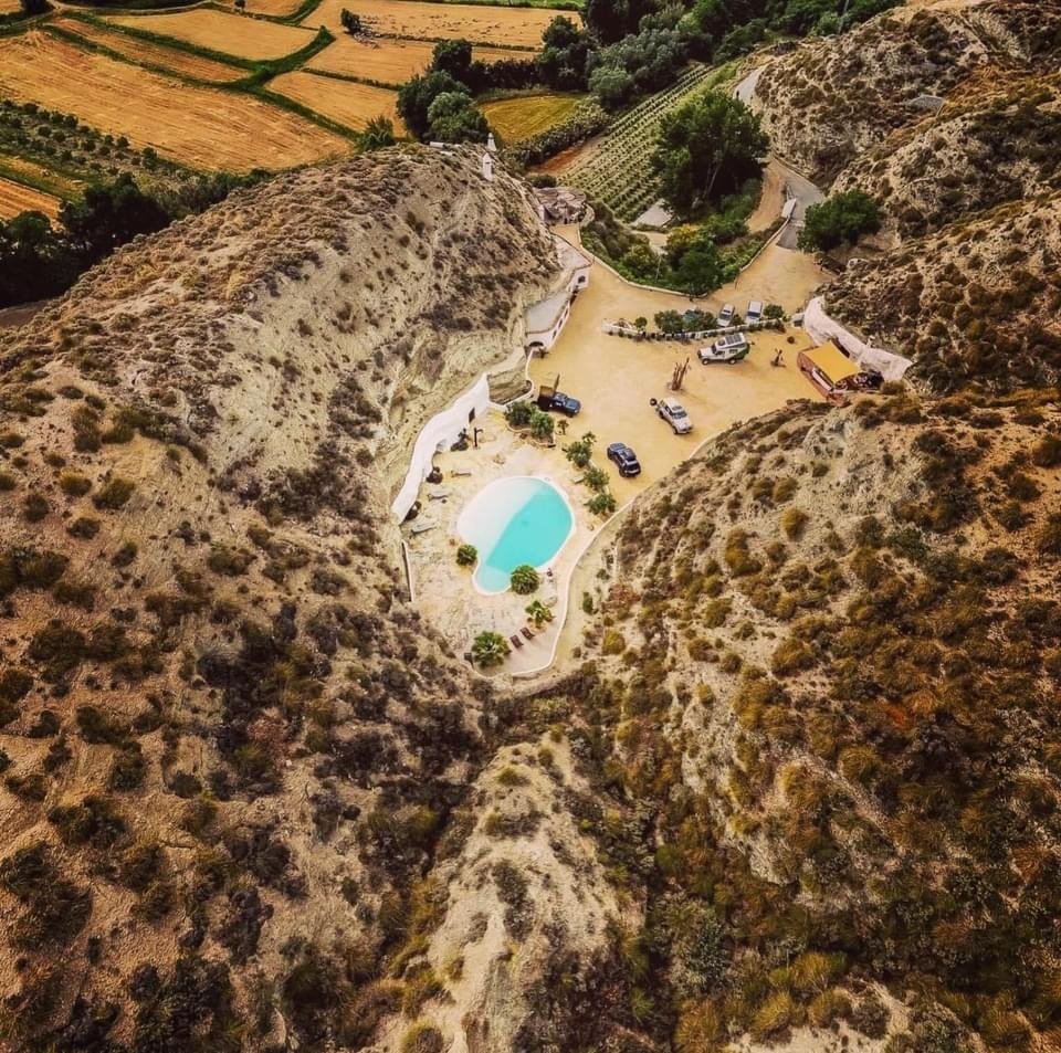 Zona de piscina bordeada por 3 cuevas trogloditas, y zona de barbacoa troglodita.