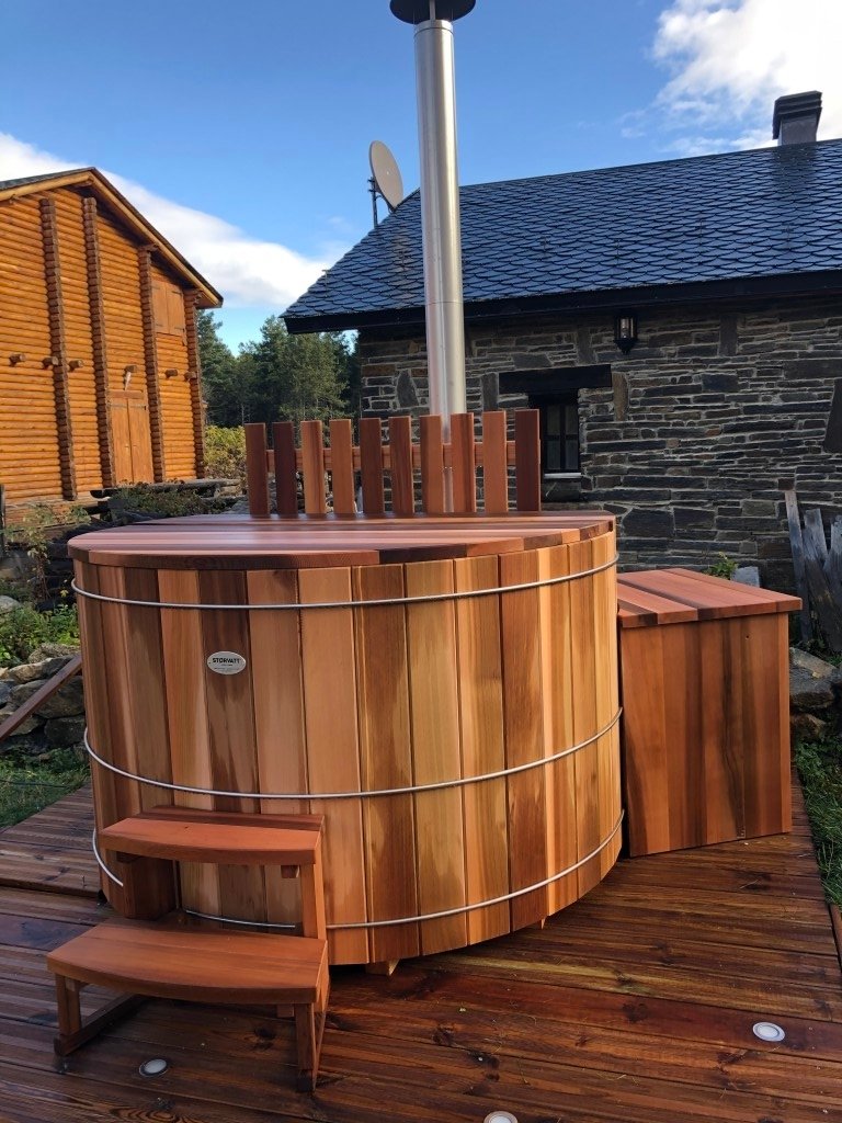 Premier chalet : grand salon de 50 m², escalier atypique donnant sur une mezzanine, trois chambres et deux salles de bain