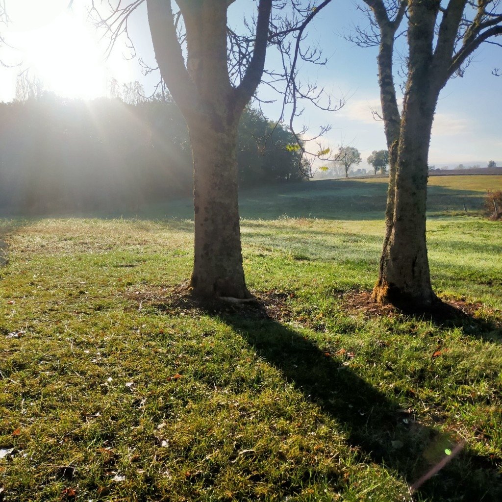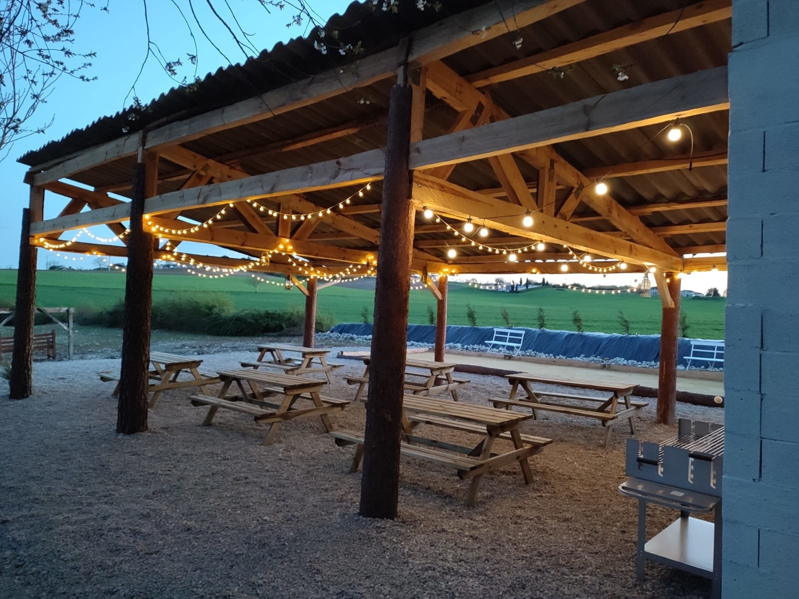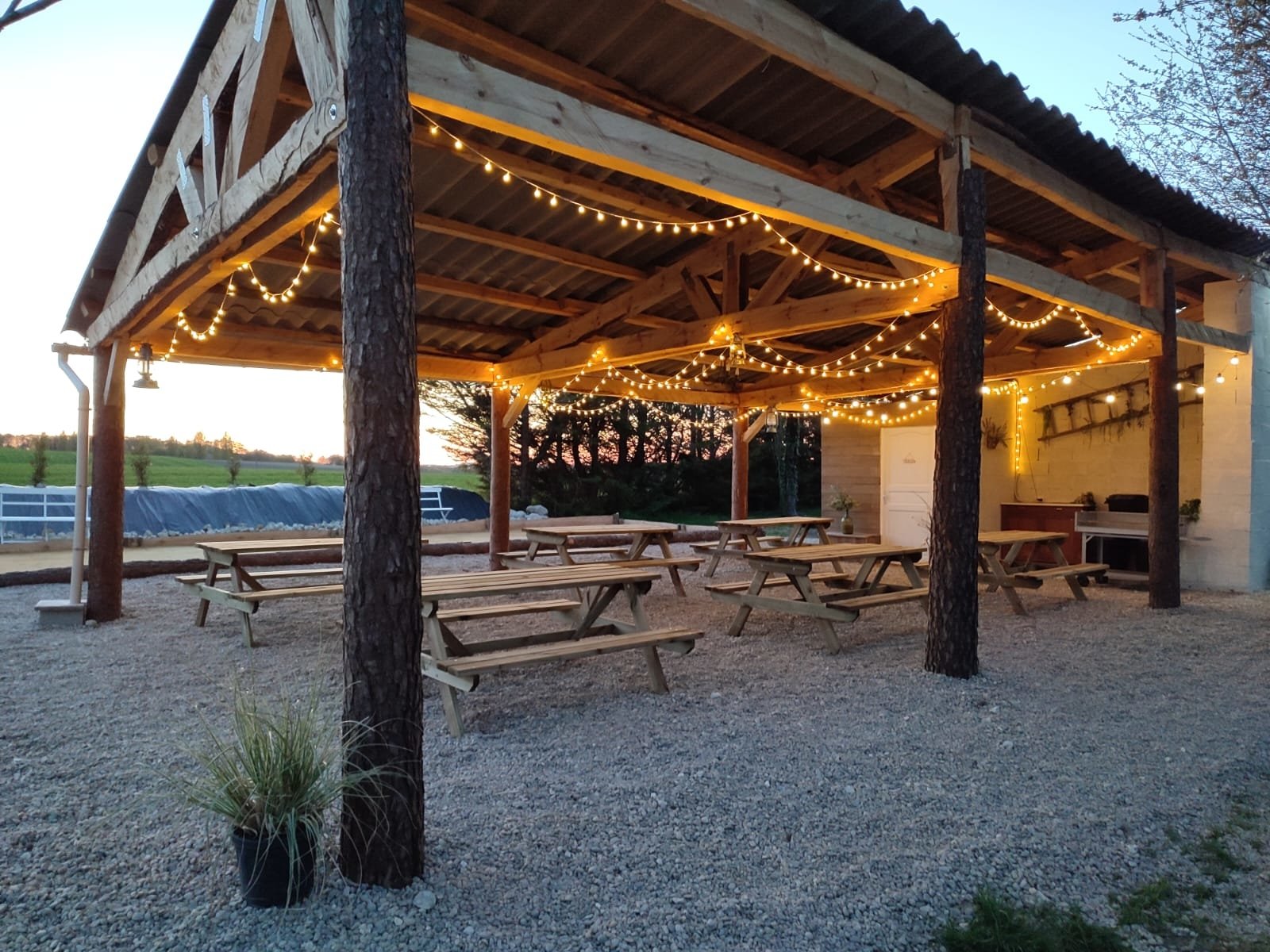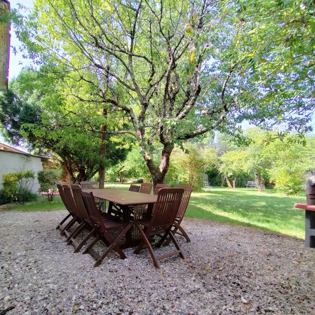 En extérieur, espace piscine avec petite guinguette donnant sur les prés et un cimetière et parc paysager et ombragé.