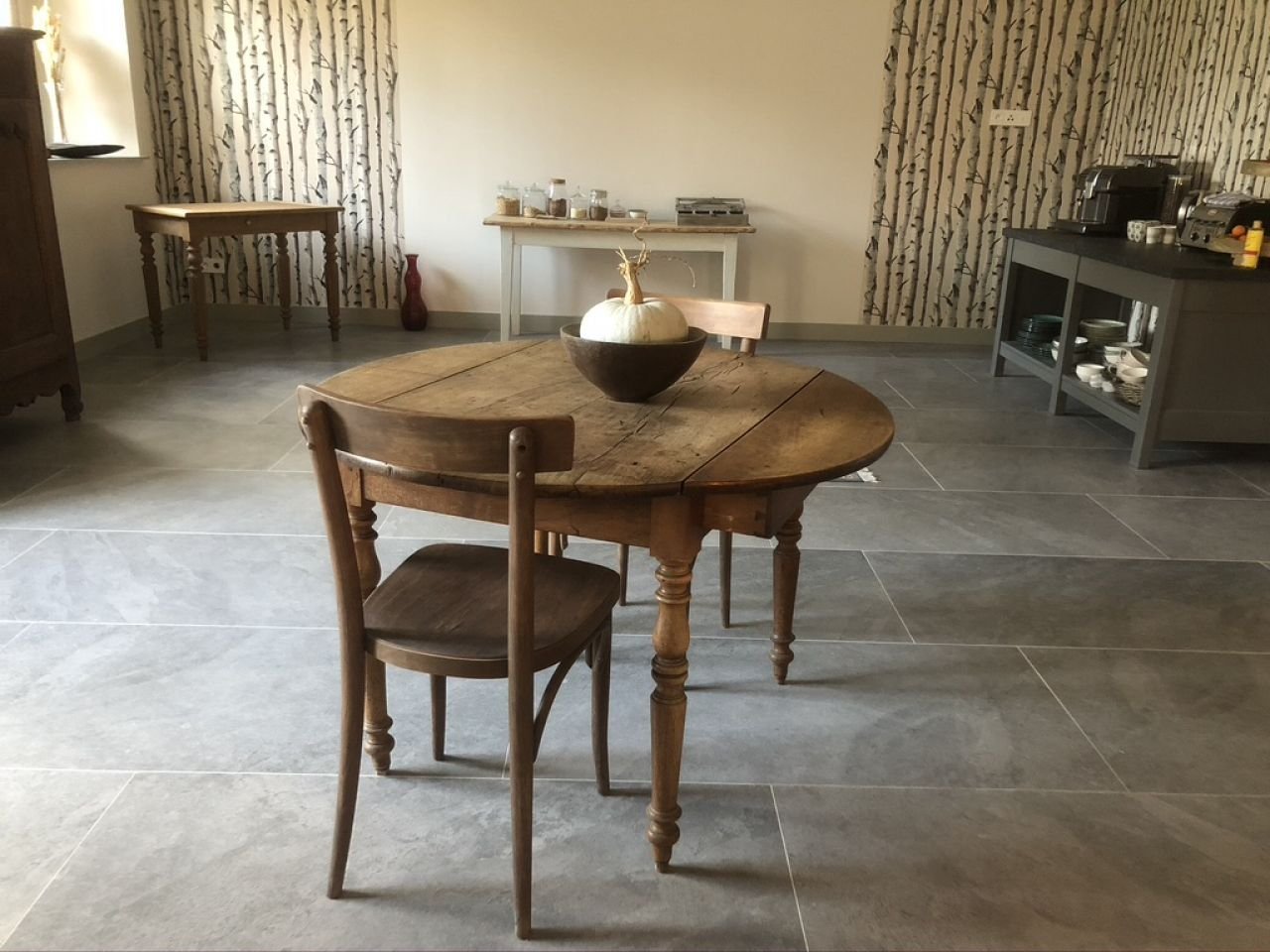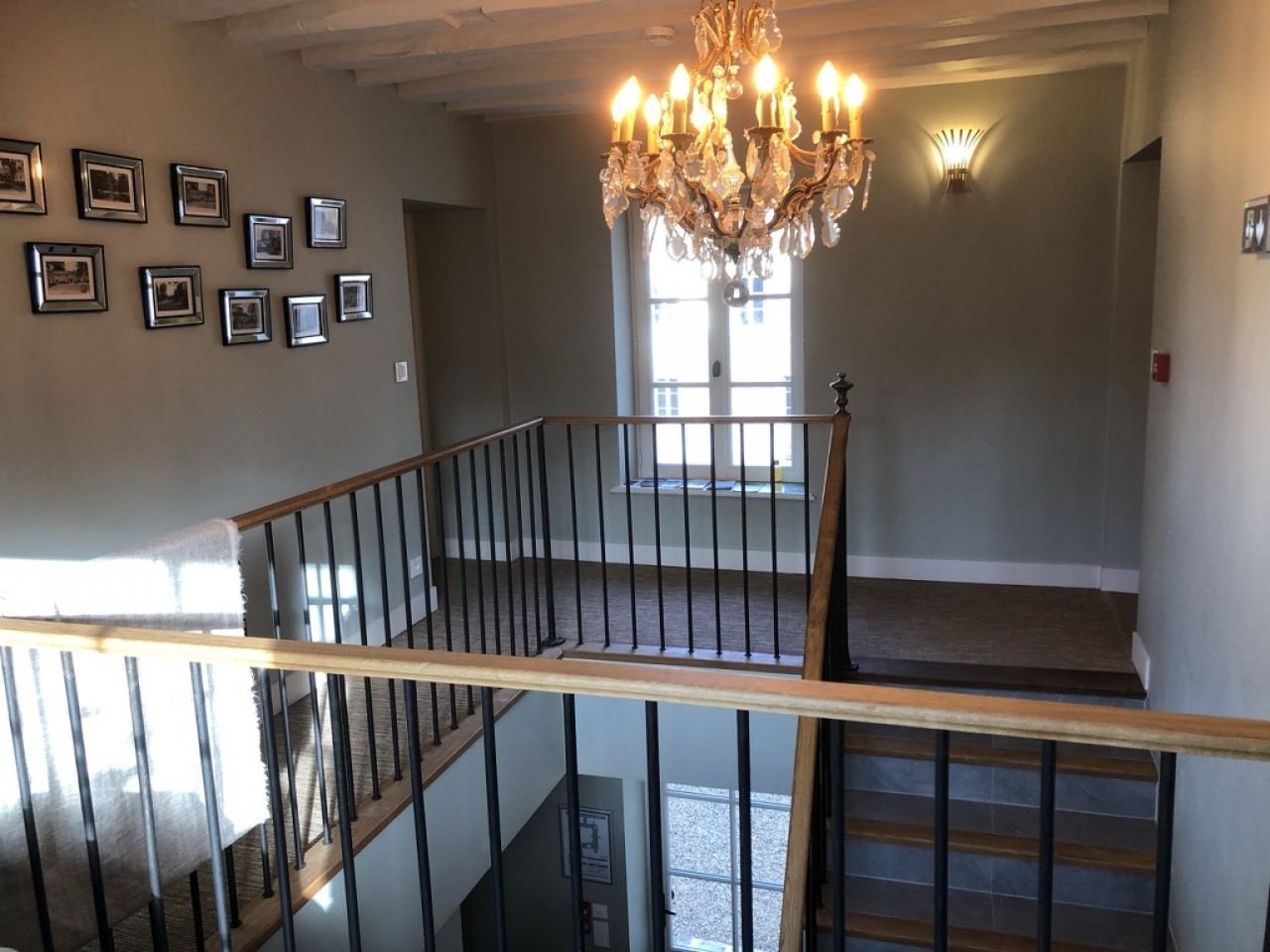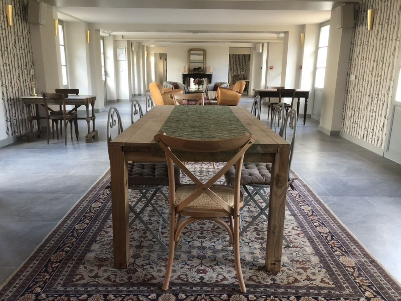 - 1 grande salle de 160 m² avec un coin cheminée/canapé et des tables pour la restauration
