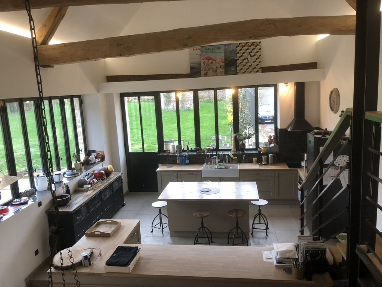 - 1 cuisine avec de grandes baies vitrées, salle à manger et salon attenant (surface totale 60 m²)