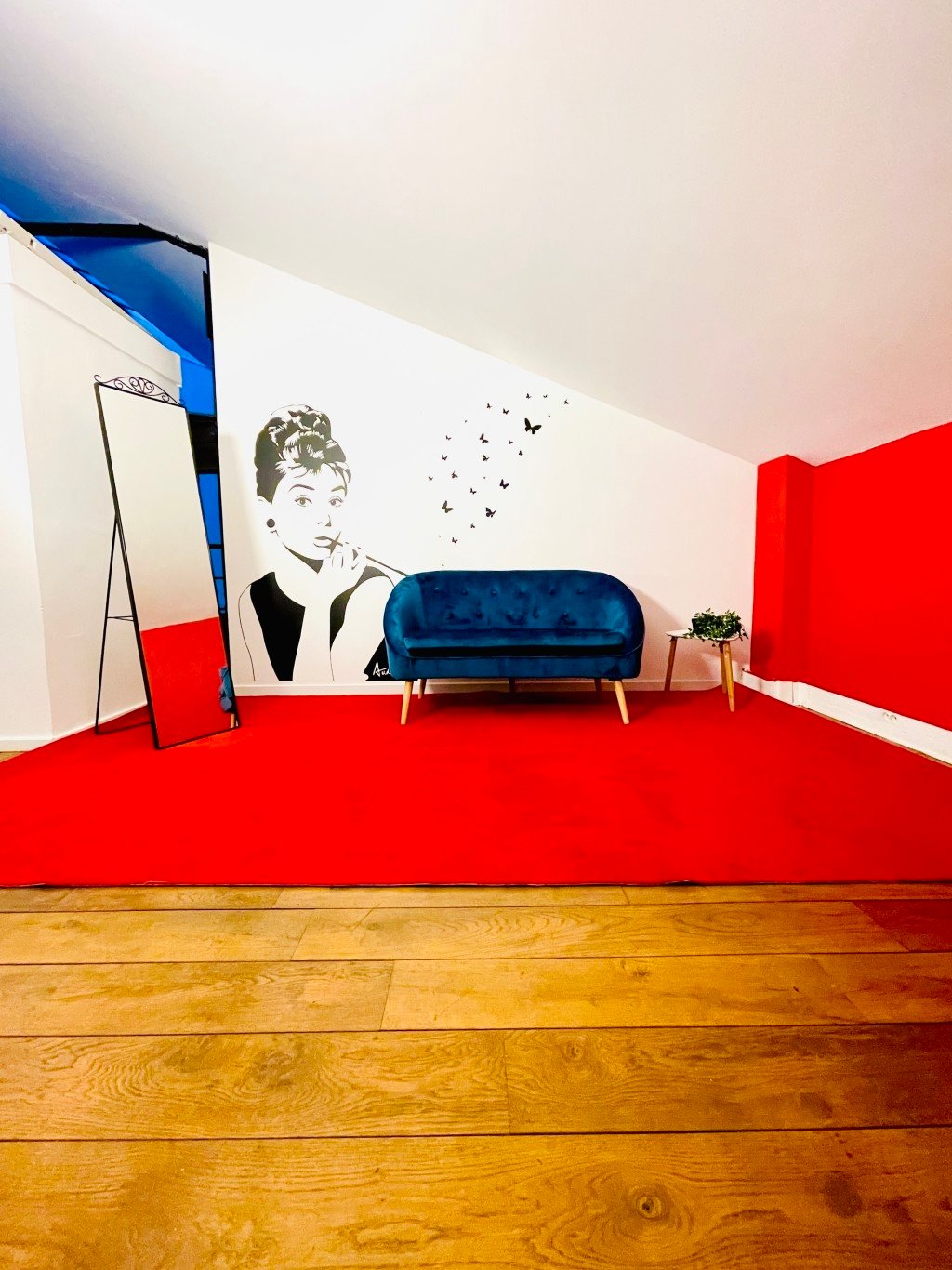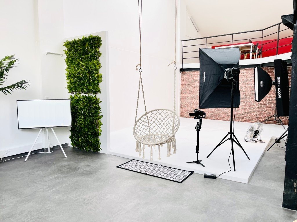 - multiples décors tels qu’un mur de briques, des fonds papier colorés, un décor salon et loft industriel composent le studio photo/vidéo. Une grande loge avec tapis rouge est aussi disponible