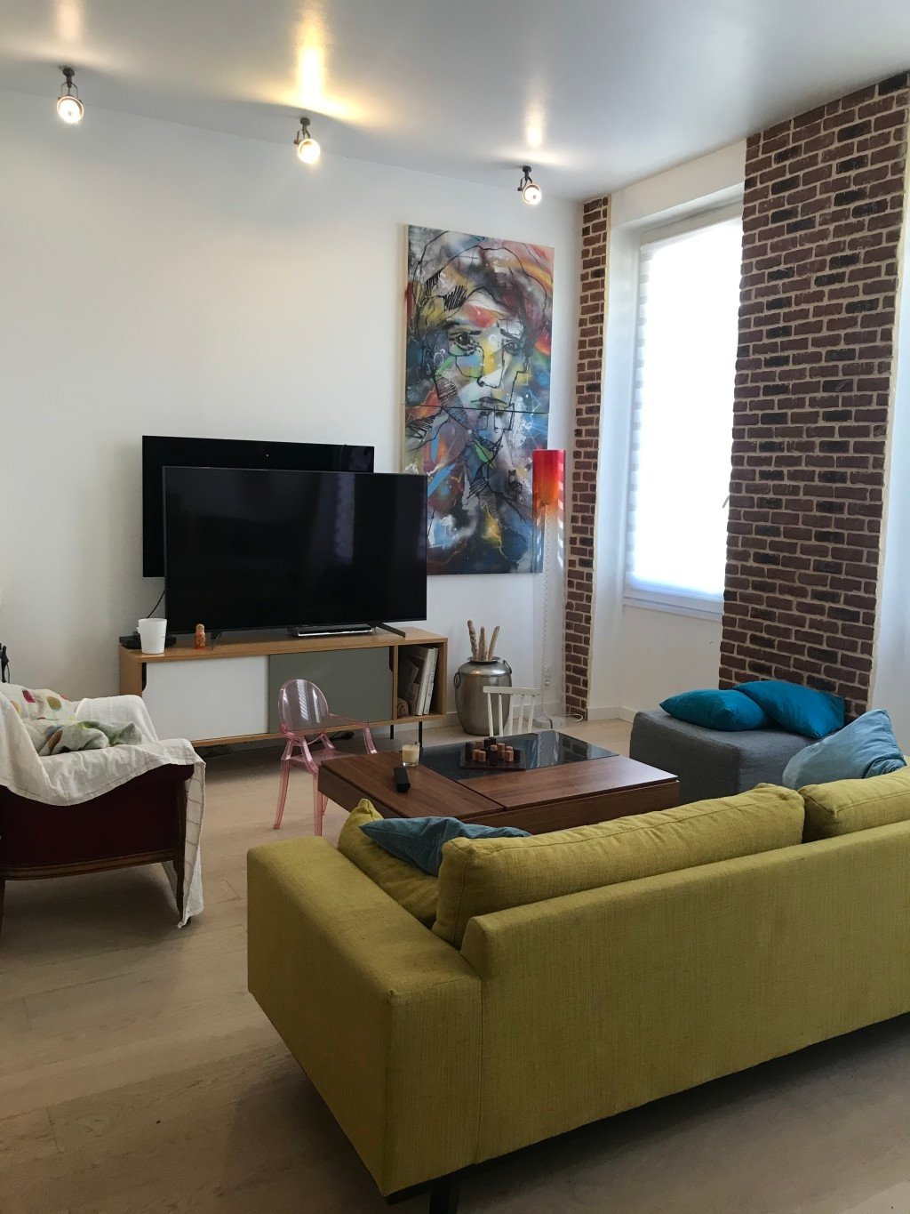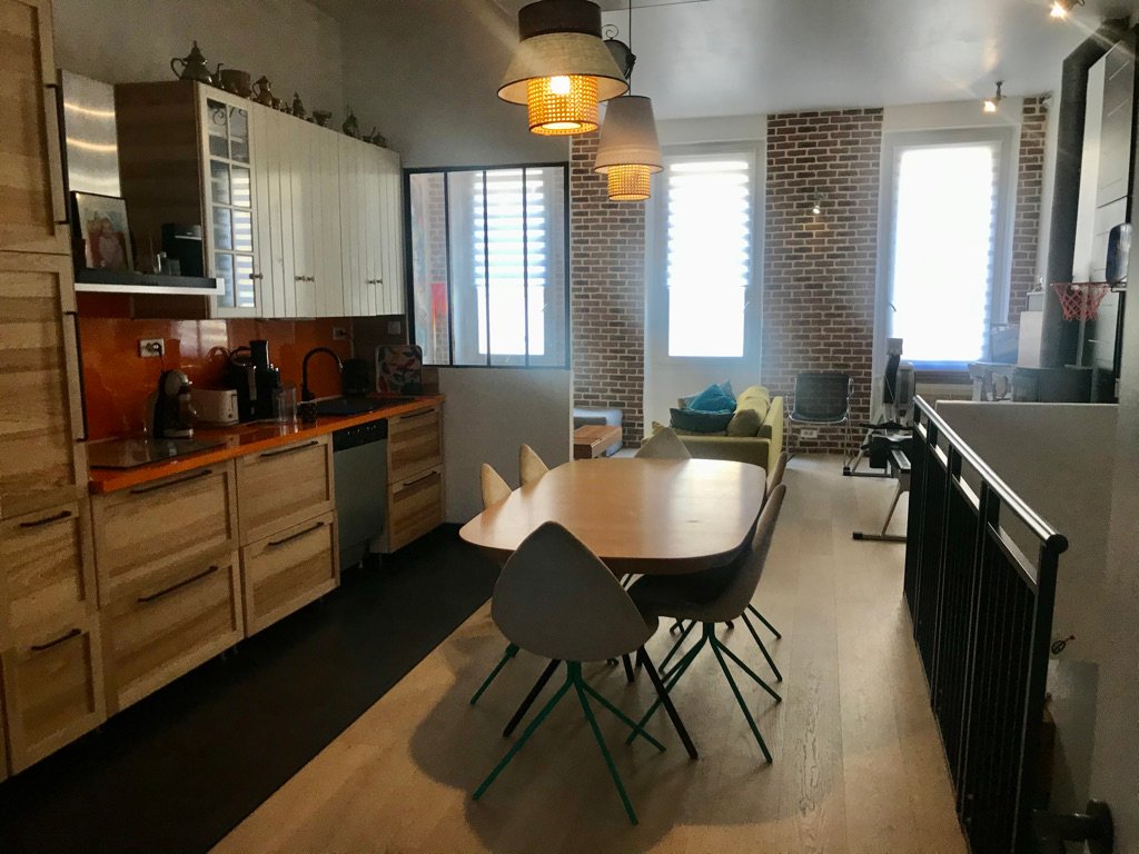 - entrée indépendante avec escalier large d'environ 1m20 menant au 1er étage : espace de vie de 55 m2 composé de la cuisine ouverte/américaine et à sa droite, en prolongement, grand salon avec poêle à bois, murs en briques
