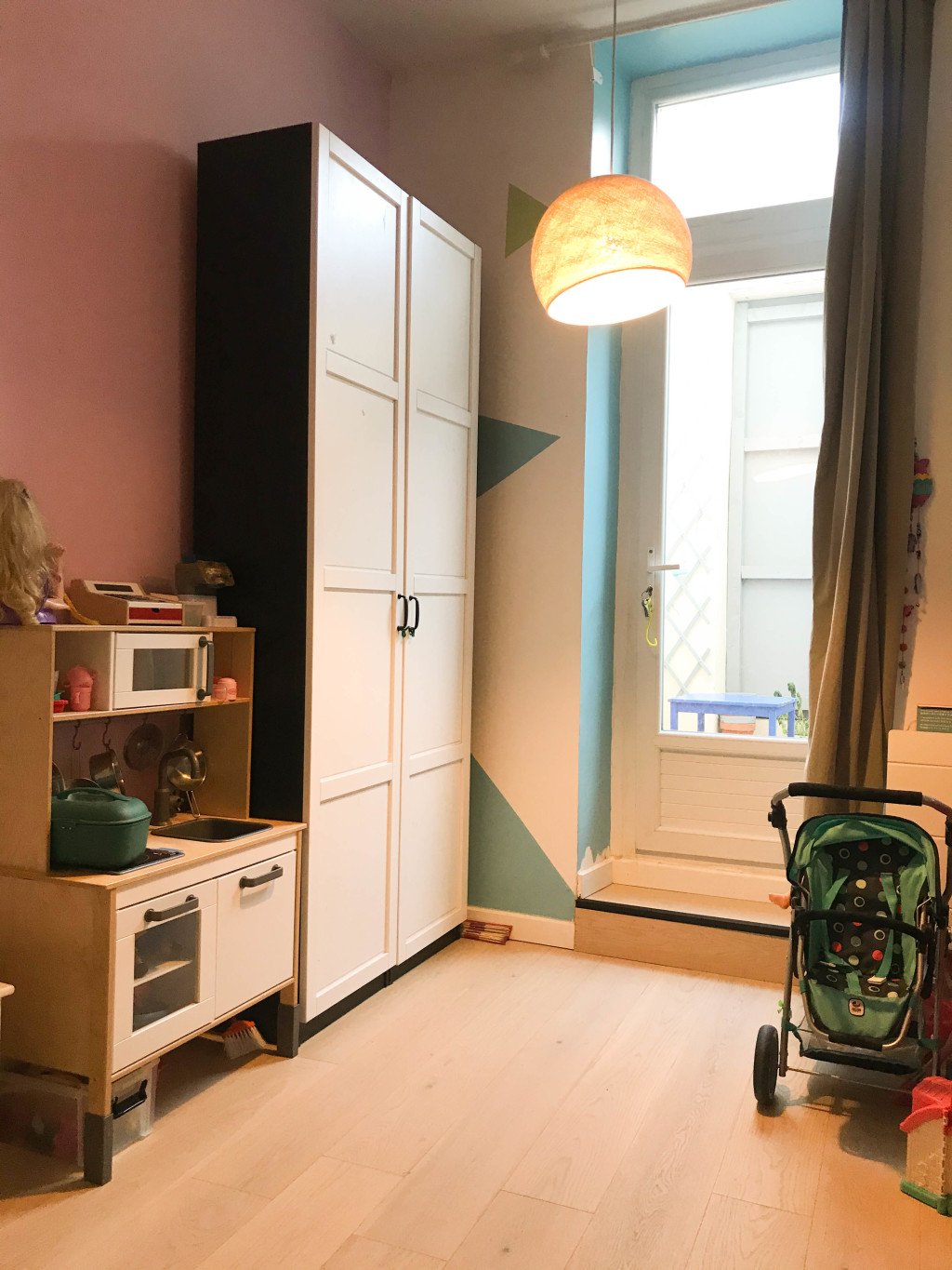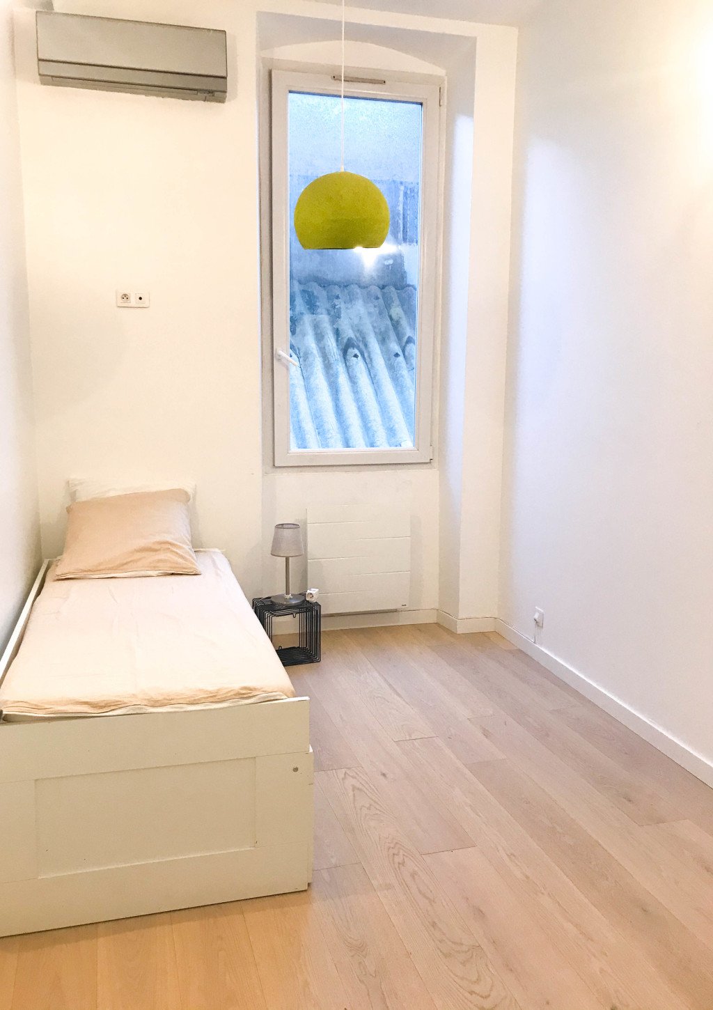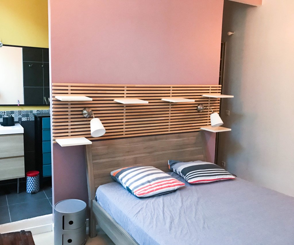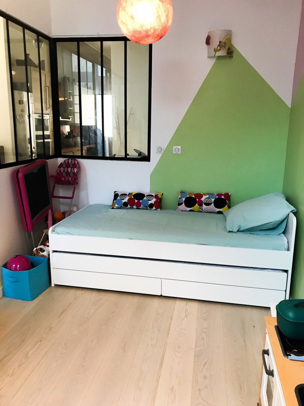 - à gauche de la cuisine : espace nuit, avec une chambre enfant toute en verrière donnant accès à petite terrasse de 7 m²