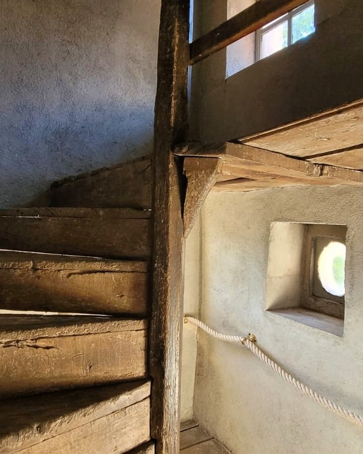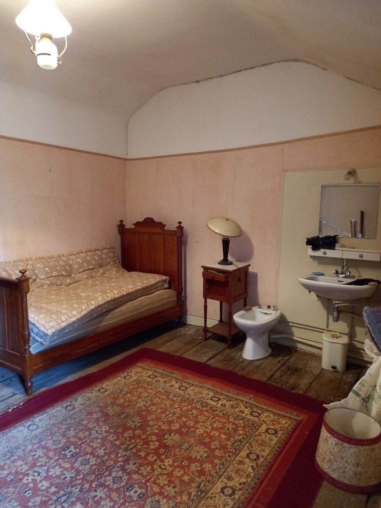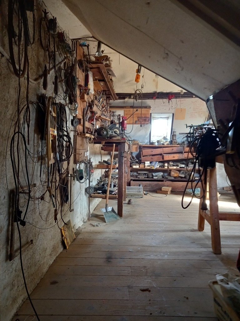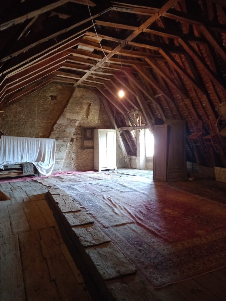 Au dessus : beau grenier avec charpente en coque de bateau retournée, chambre de bonne et atelier.