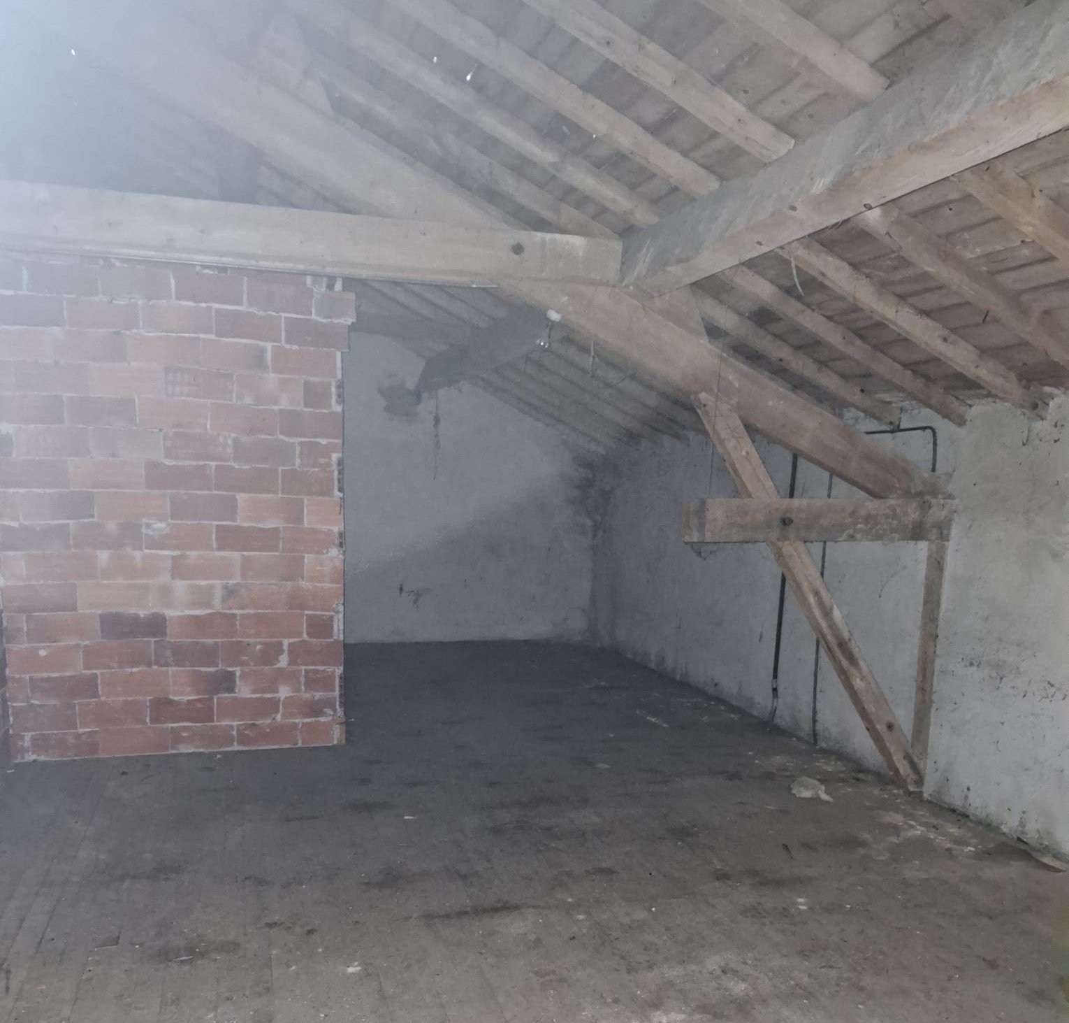 L'appartement du 2e étage se situe sous les toits. La surface est également d'environ 80m². La charpente est apparente. Il comporte 2 chambres, une grande pièce vide sans fenêtre et une petite pièce d'environ 10m² sans fenêtre.
