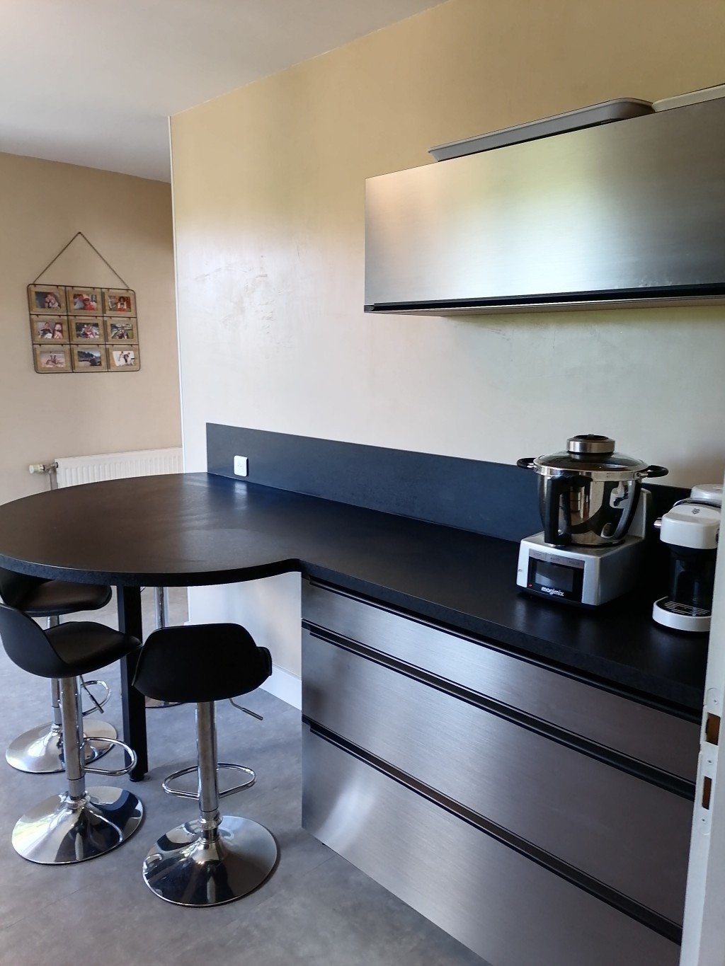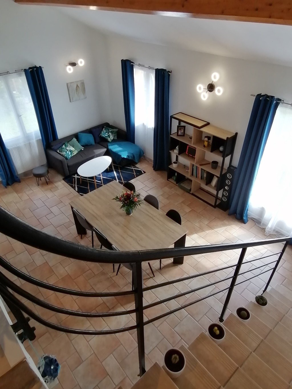 - mezzanine de 30m² aménagée en salon et bureau. Cette grande pièce a une hauteur sous plafond de 7 mètres avec poutres apparentes et cheminée