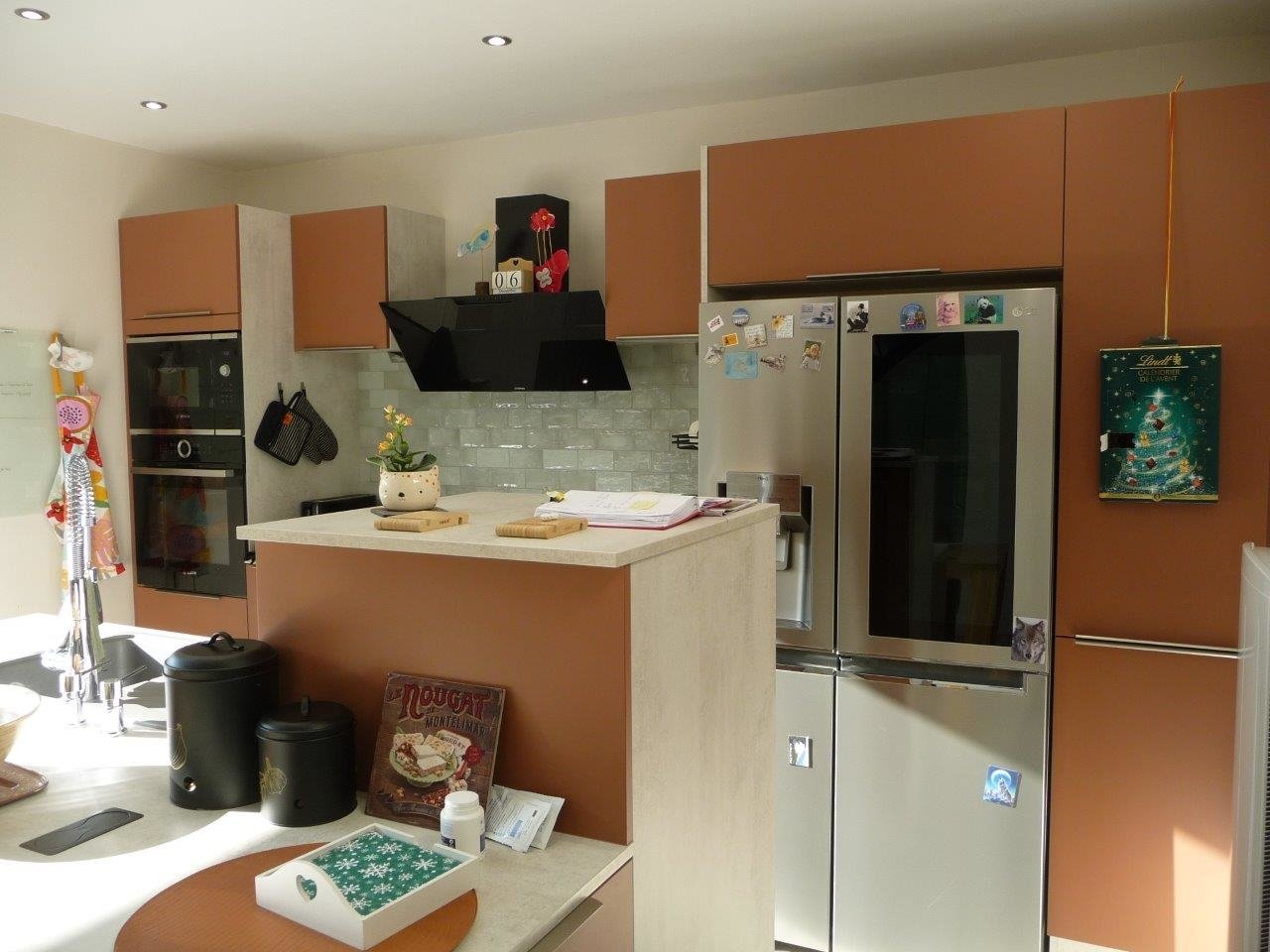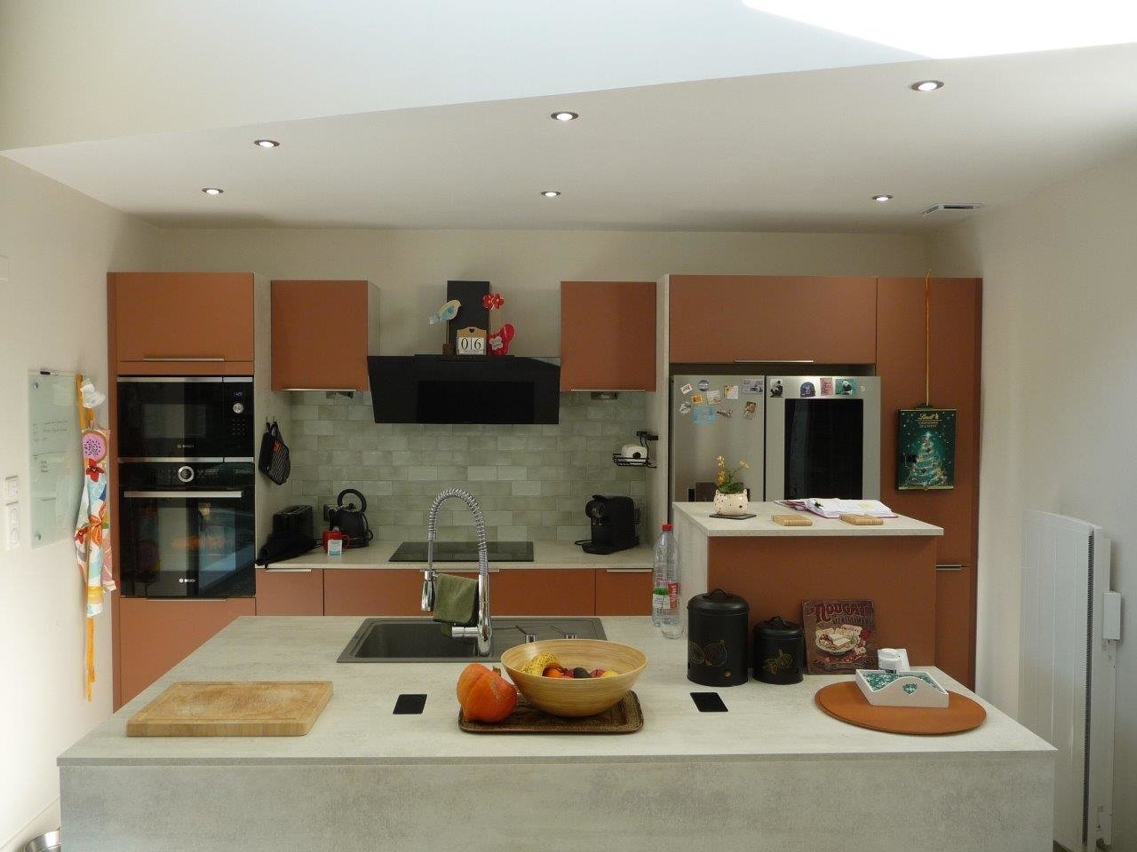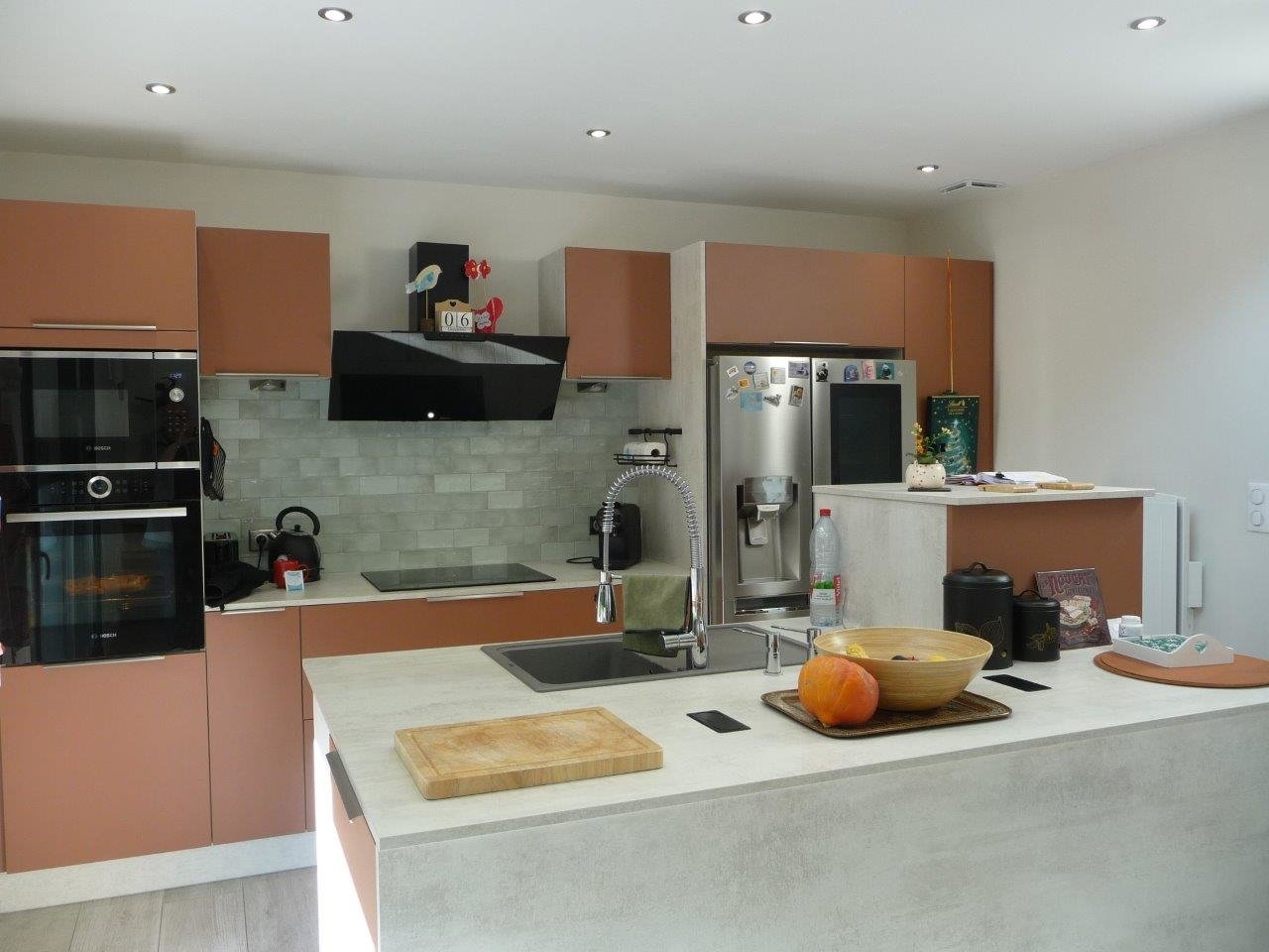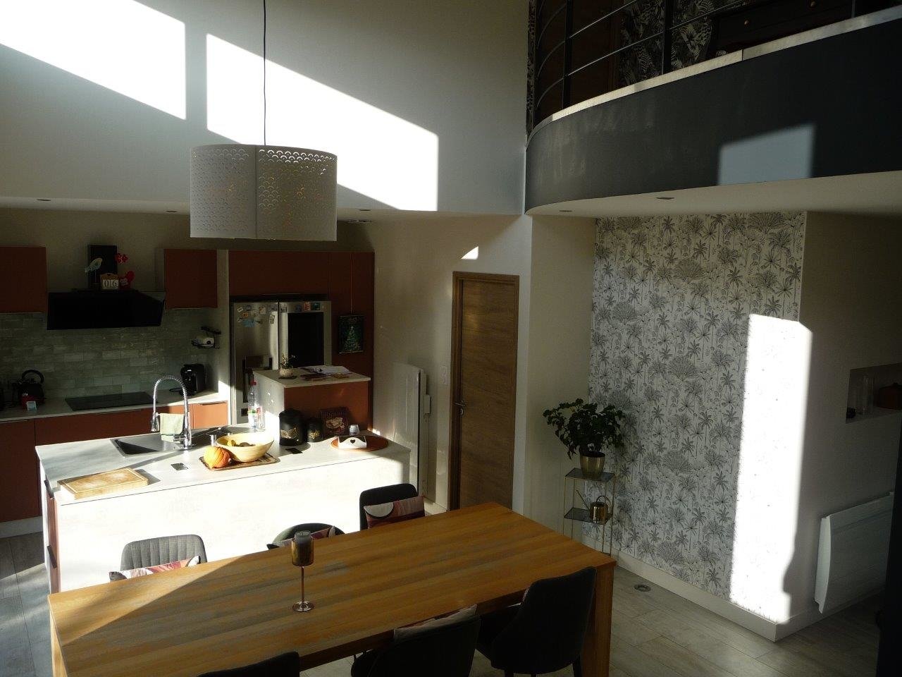 Salon semi-ouvert, cuisine américaine entièrement équipée donnant sur la salle à manger avec plafond cathédrale (5m de hauteur sous plafond) : 46m²