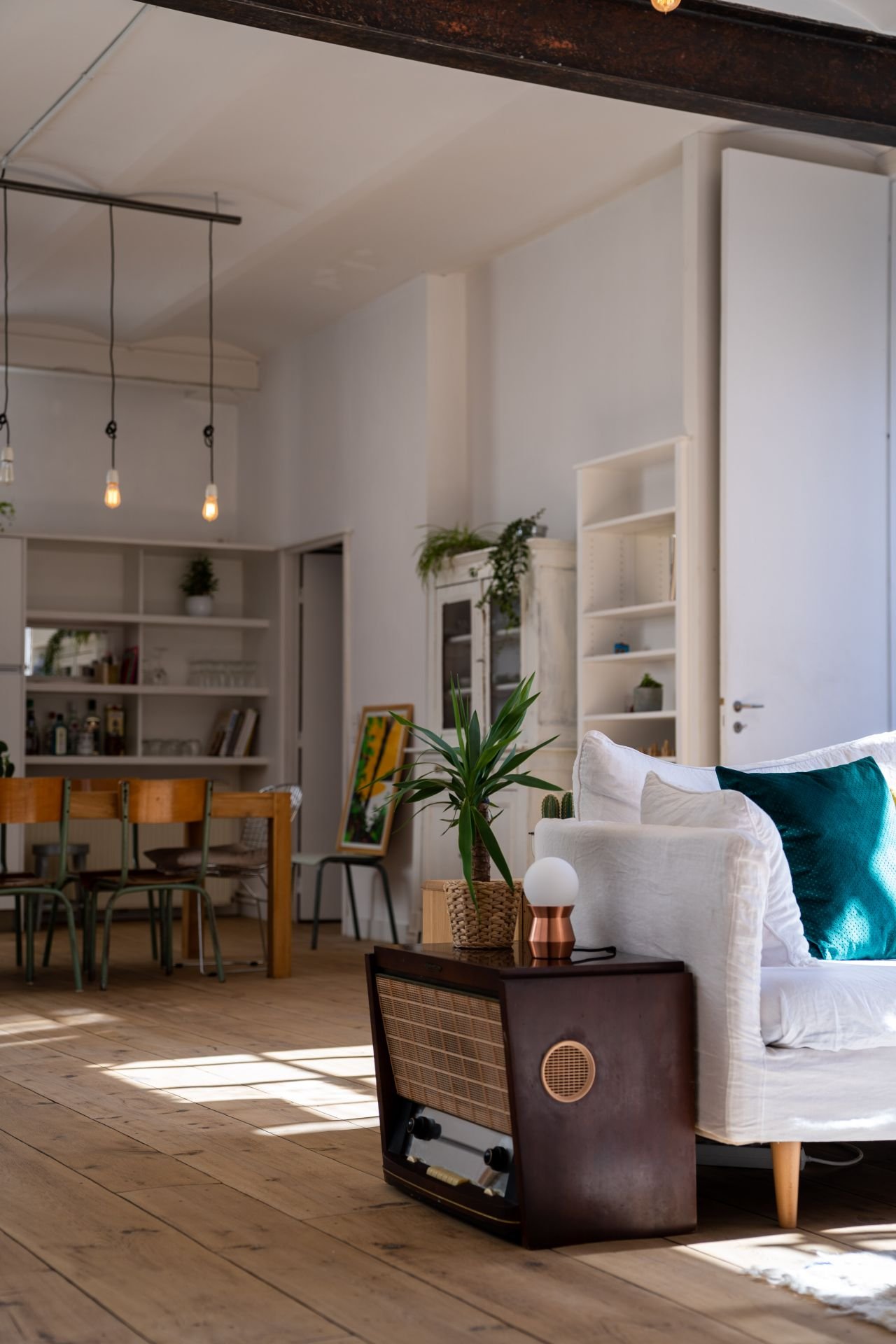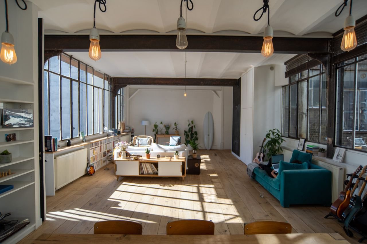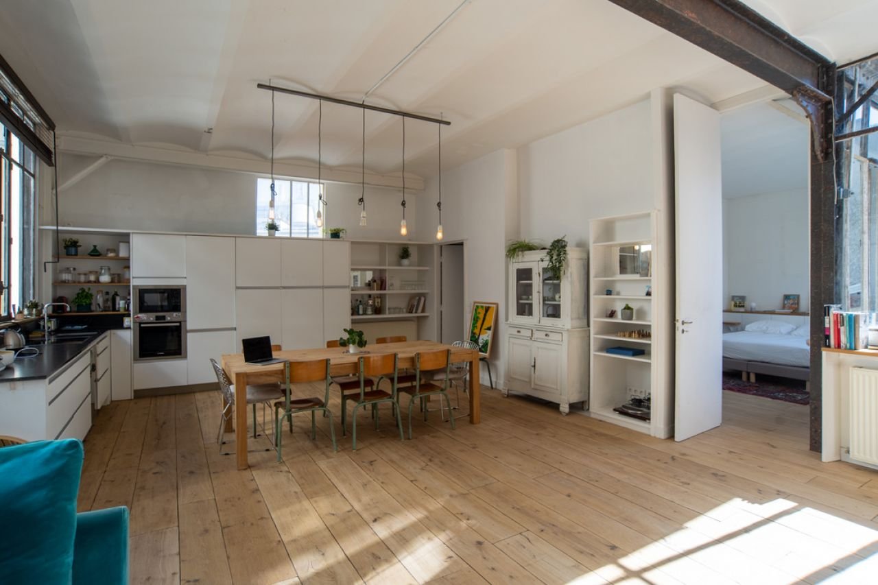 Baigné de lumière, haut de plafond, le loft est niché dans une ancienne imprimerie.