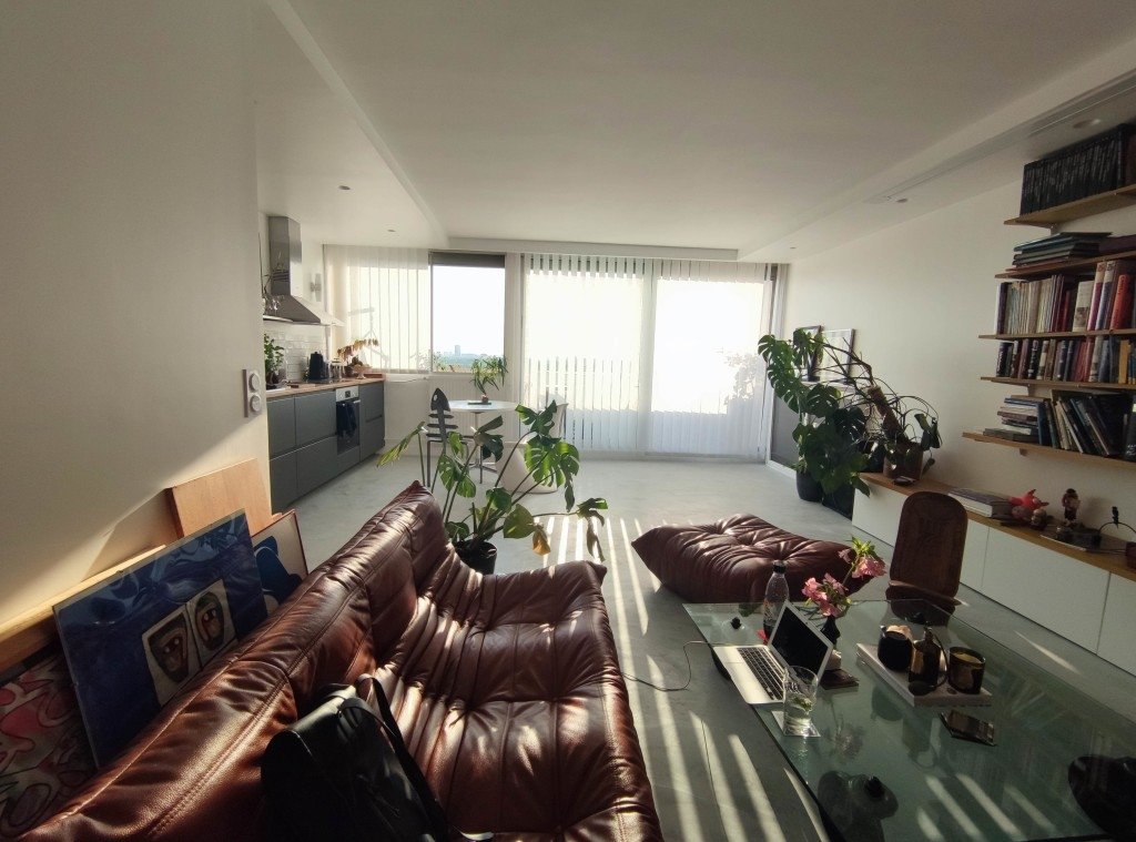 Apparemment au 13m étage, vue sur Paris. Duplex dans un immeuble des années 79. Entièrement refait a neuf. Béton cirée, spots encastrés italiens, parquet bois massif, pièces de design (Togo en 3 pièce, table basse gae aulenti par Fontana, table Henri miller, chaise pantone... Douche italienne et chambre avec vue sur Paris.