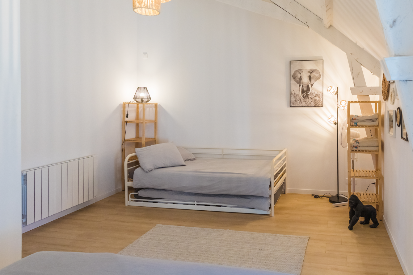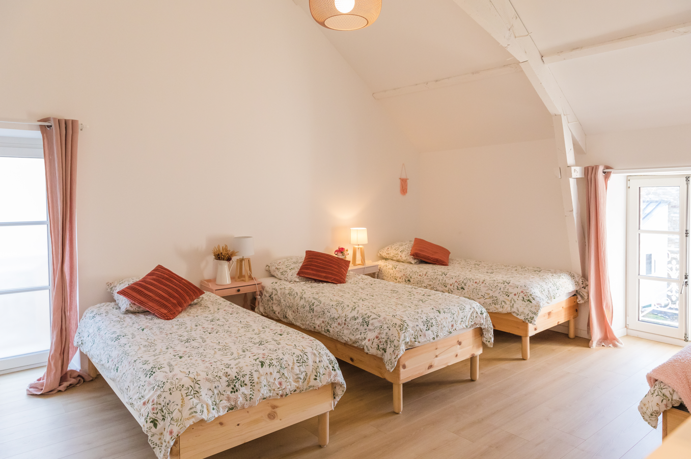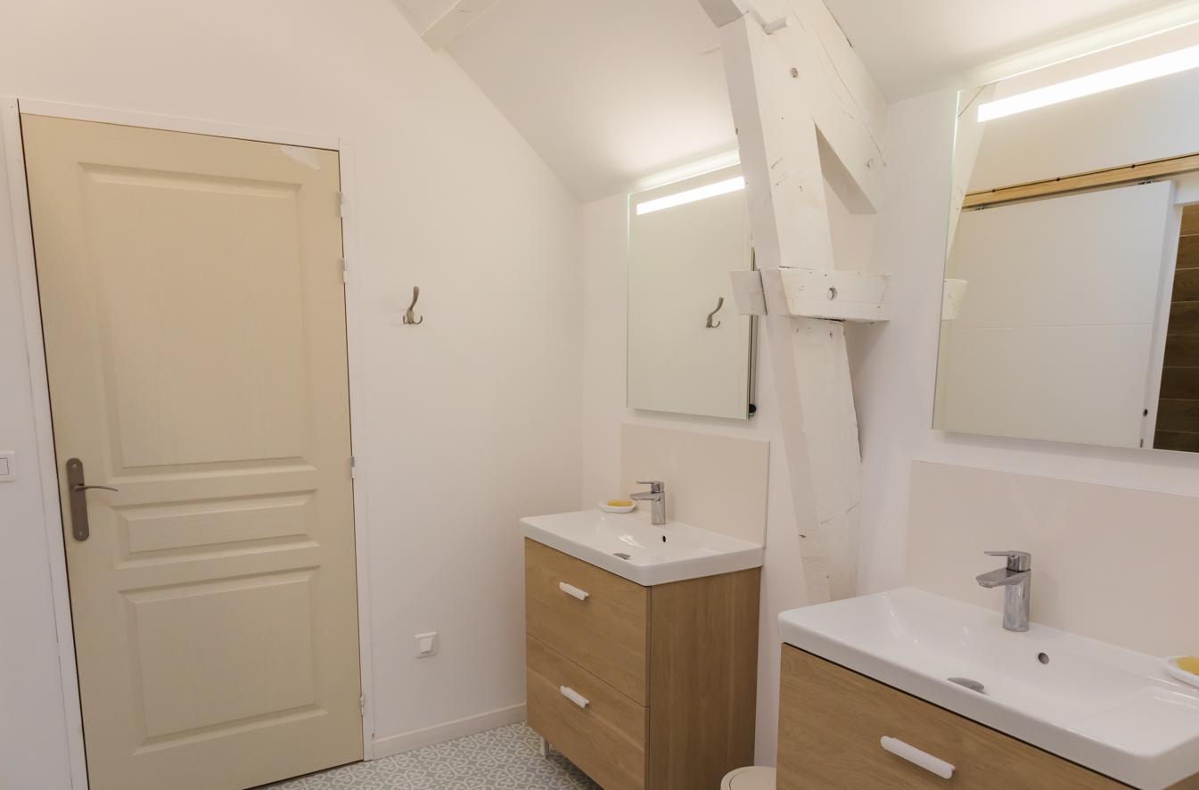 L'escalier mène au 1er étage composé d'un palier, de 4 grandes chambres dont une avec salle d'eau et wc, ainsi qu'une salle d'eau commune avec 2 douches privées et un wc séparé.