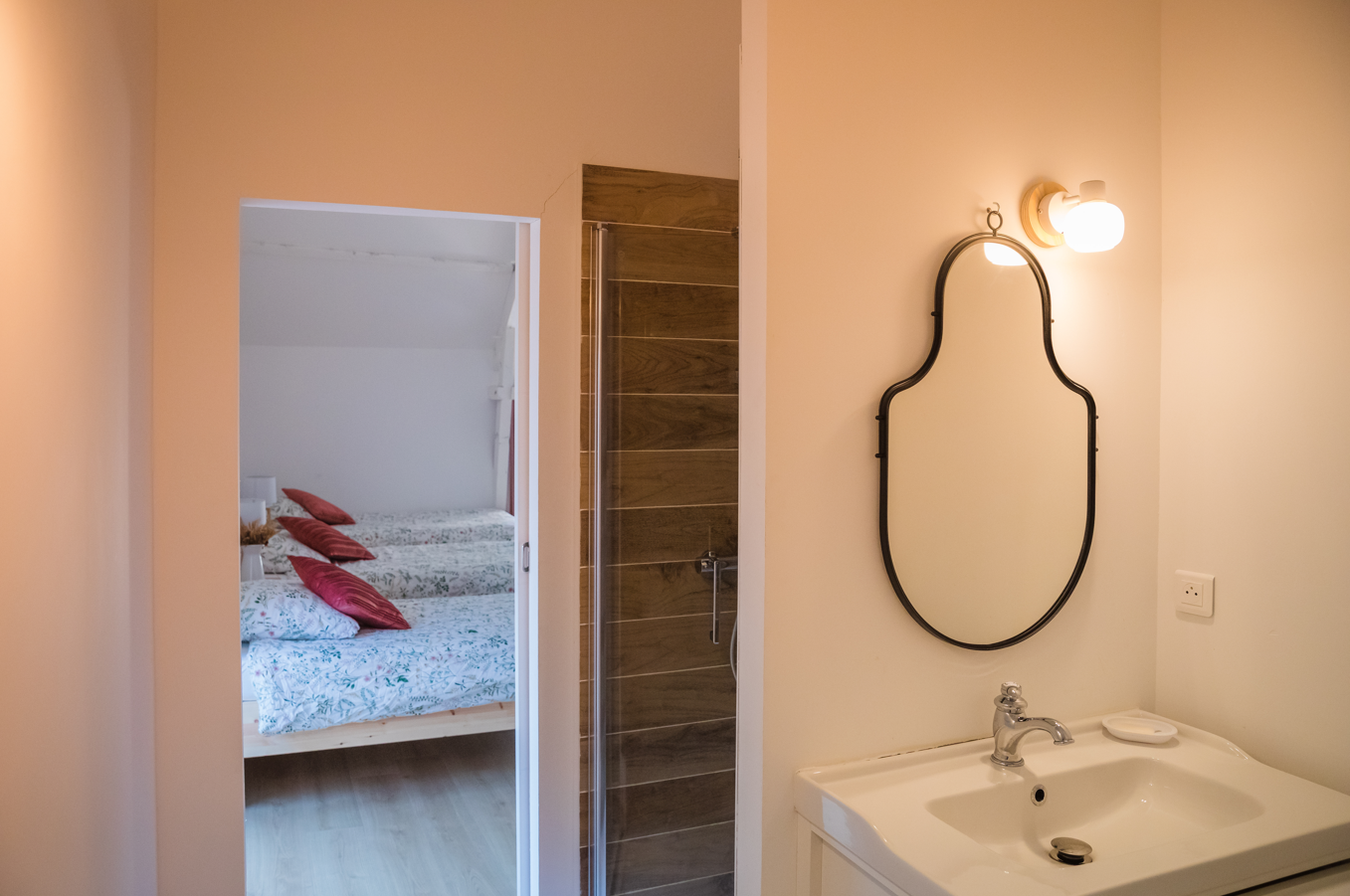 Une salle d'eau PMR avec douche, wc et lavabo.
