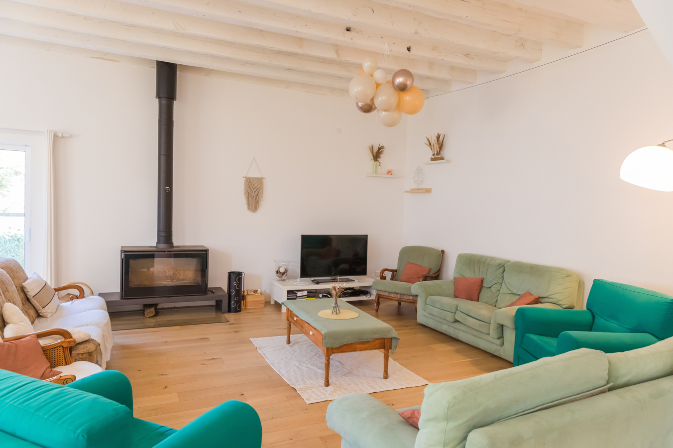 Un coin salon avec poêle à bois ainsi que le coin repas.