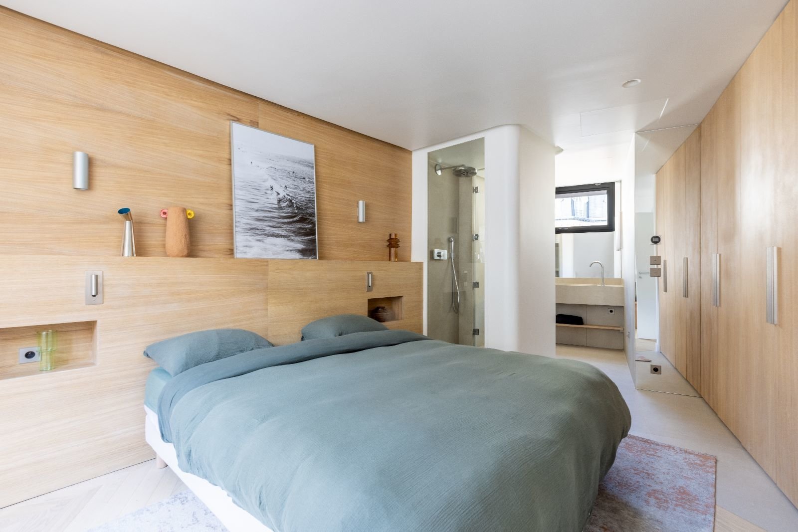 Au 1er étage, vous trouverez une chambre avec un lit double, un grand dressing ainsi qu'une douche intégrée avec lavabo.