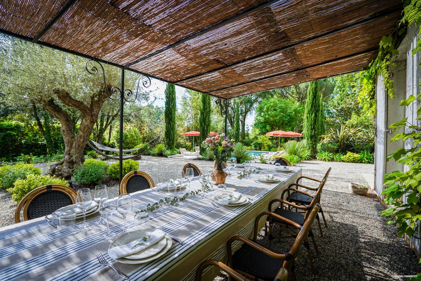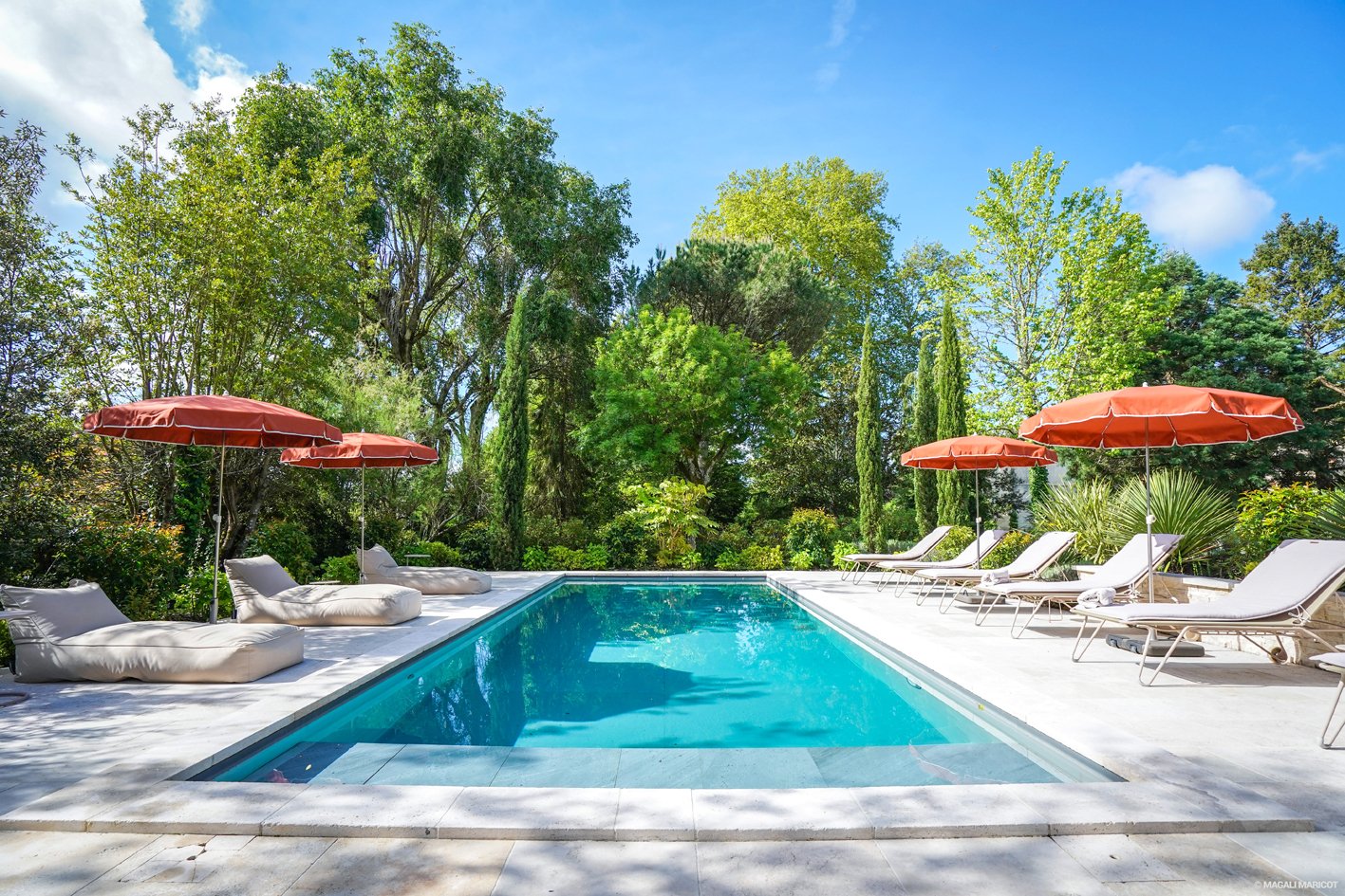 Un spacieux jardin de 2500m² avec pelouse, mobilier épuré, terrasses ombragées, parking privé et une piscine contemporaine chauffée.