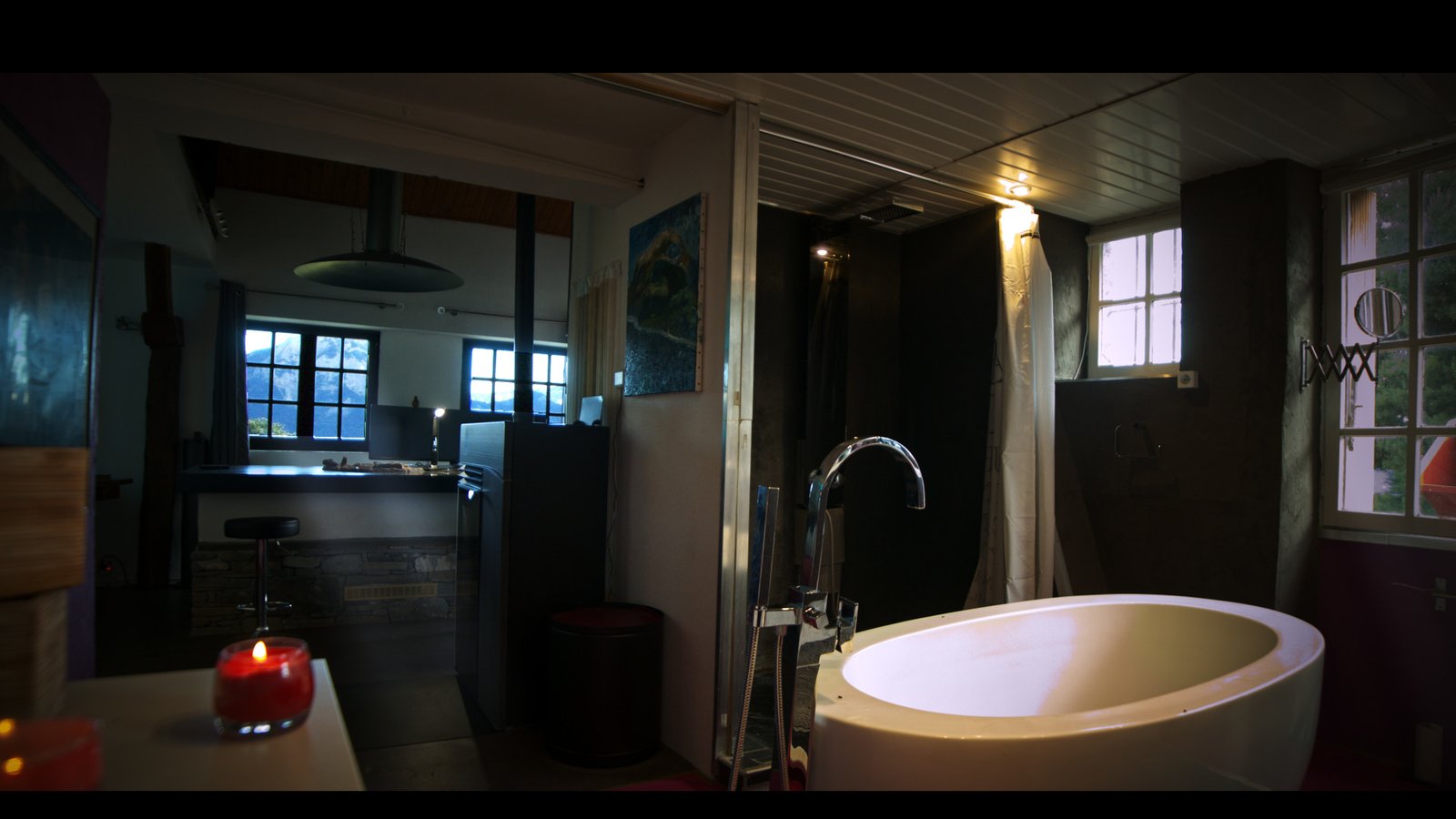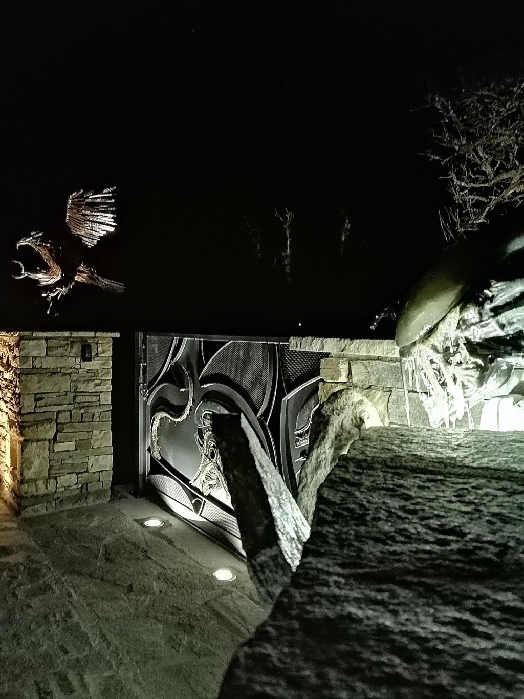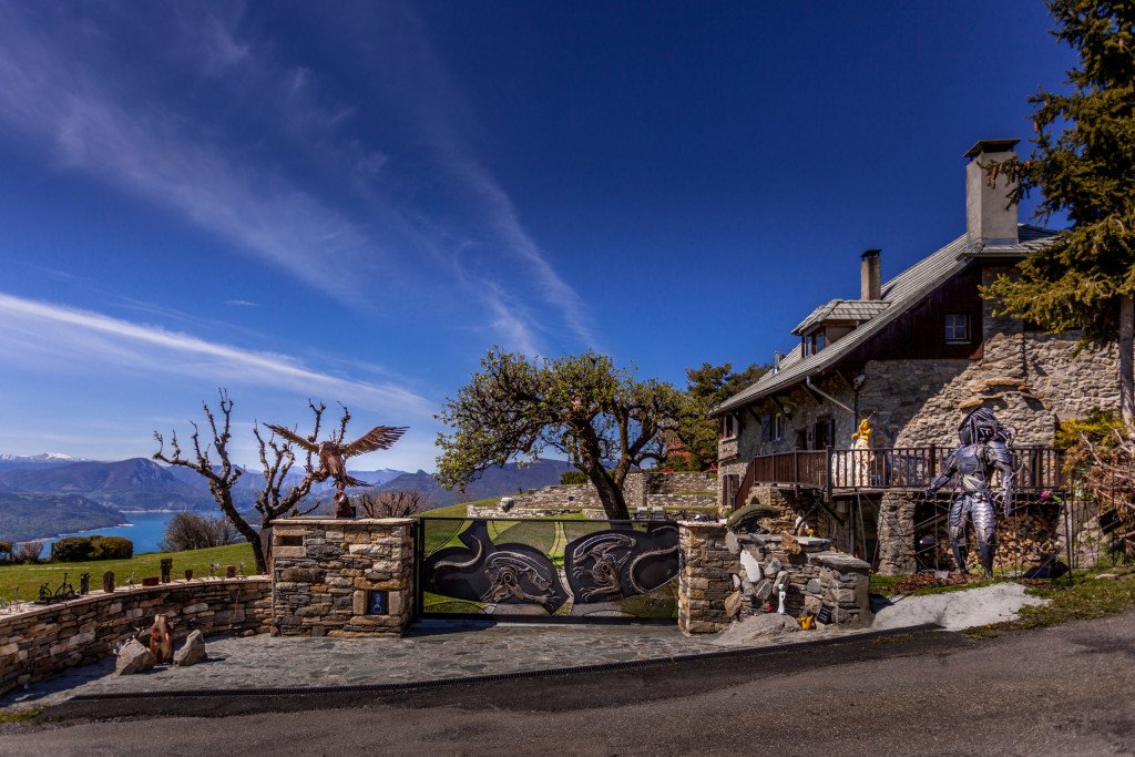 Maison située sur un terrain en montagne avec une vue panoramique de la vallée et vue sur une grande partie d'un lac et les montagnes alentours, le jardin quant à lui, est orné de statues de science fiction grandeur réelle (animées de feu et de fumées) ainsi qu’une pelouse bordée de magnifiques murs en pierres sèches.