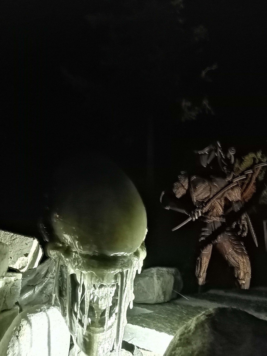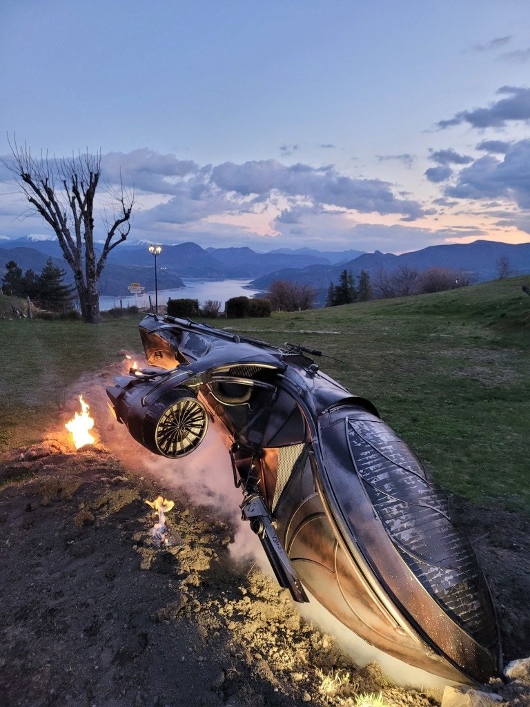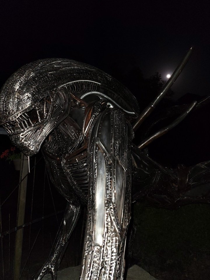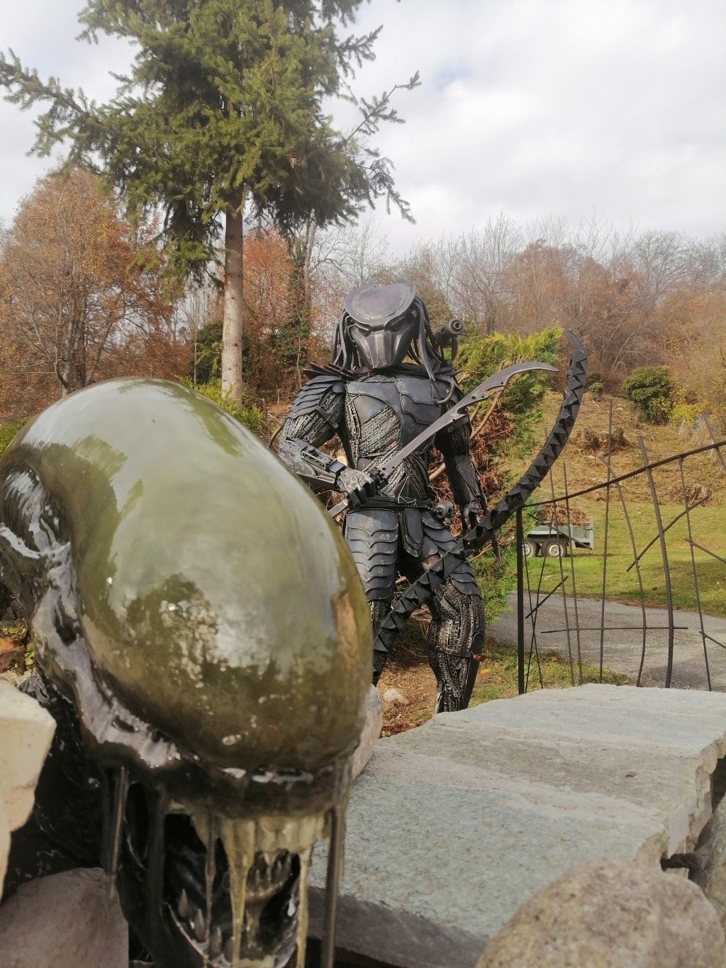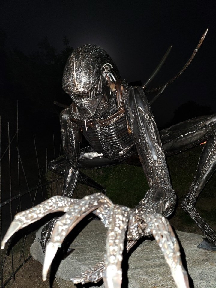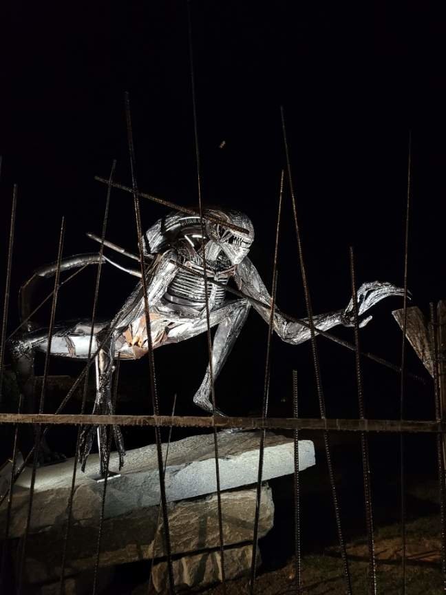 Des statues situées en bordure de terrain sont en fer forgé grandeur réelle sur le thème de Alien vs Predator en passant par Le Petit prince, sublimées par l’éclairage, les flammes et la fumée