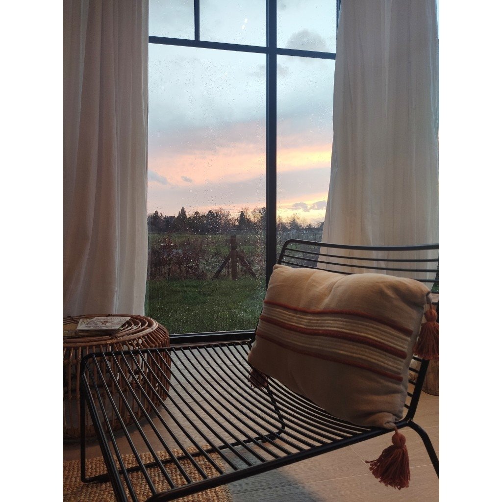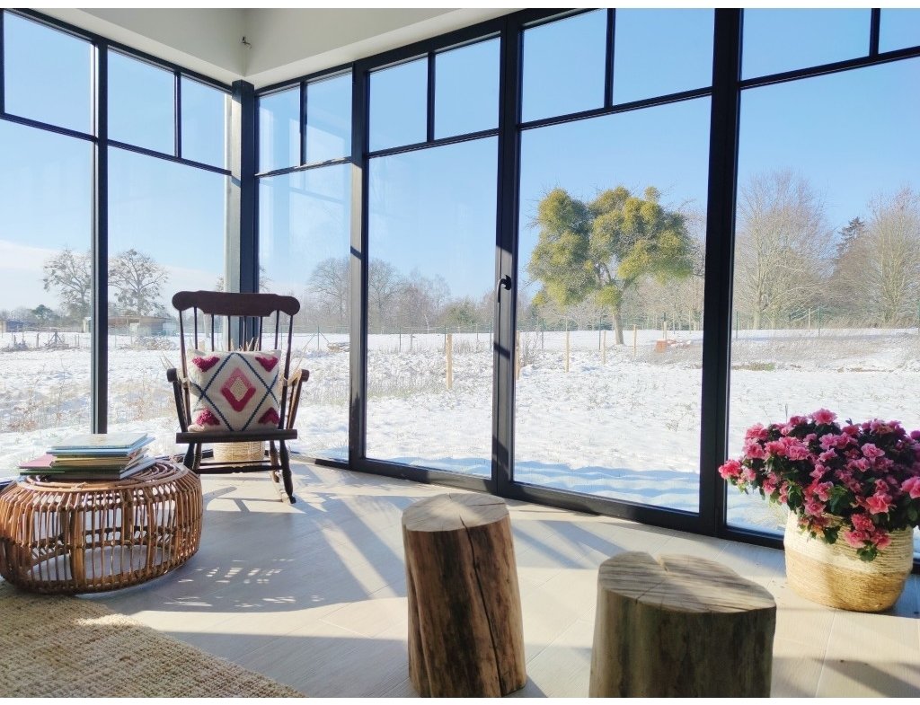 - très grandes baies vitrées avec vue sur prairies et grands arbres, très lumineux,