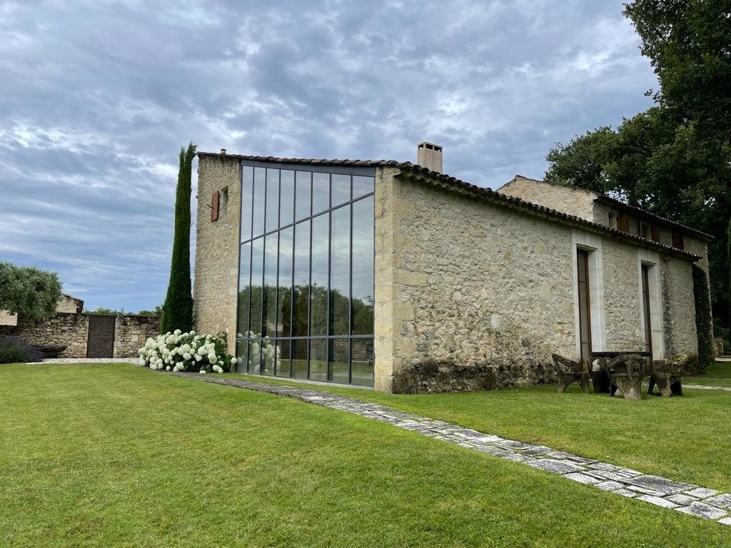 Ancienne ferme rénovée en pierres apparentes et structure en acier.