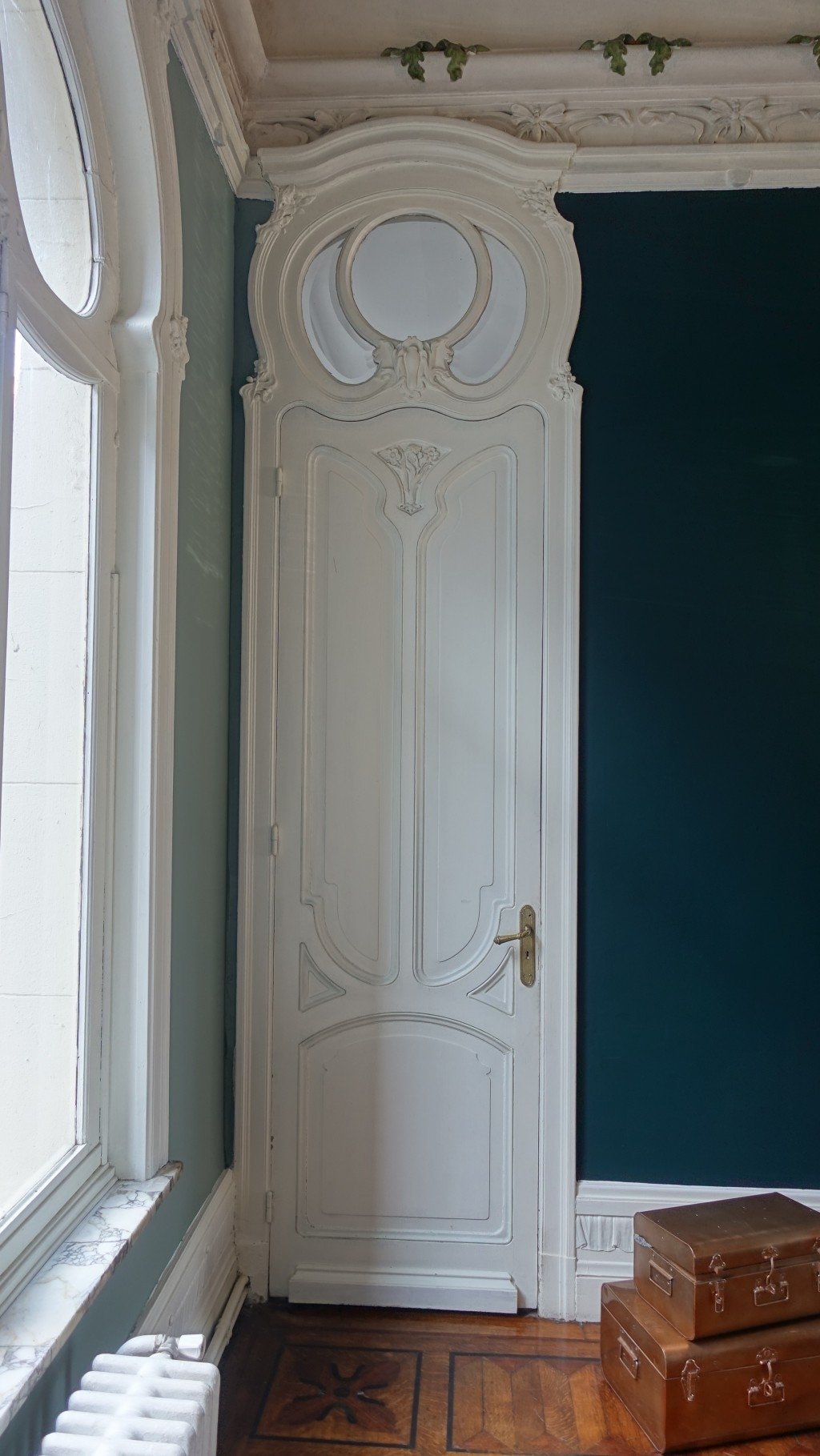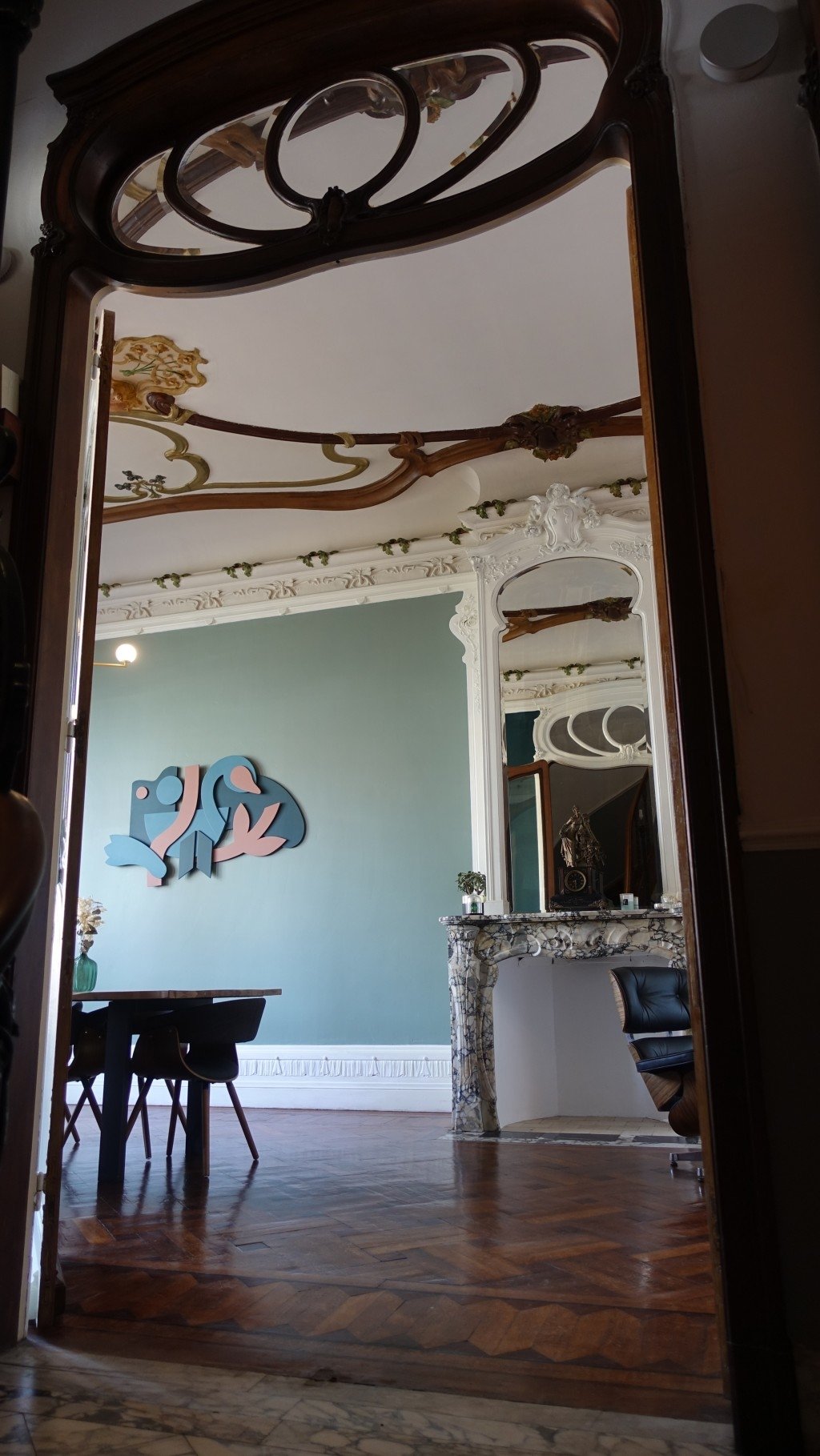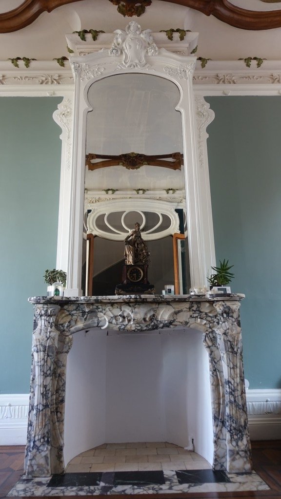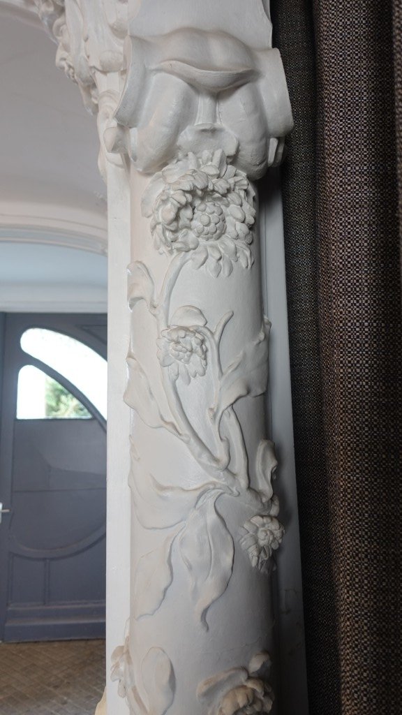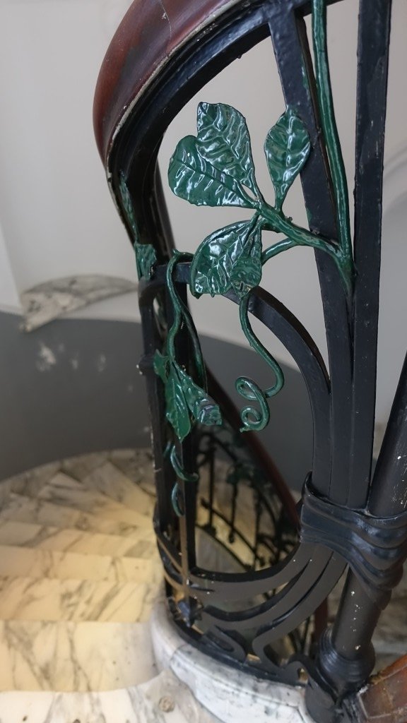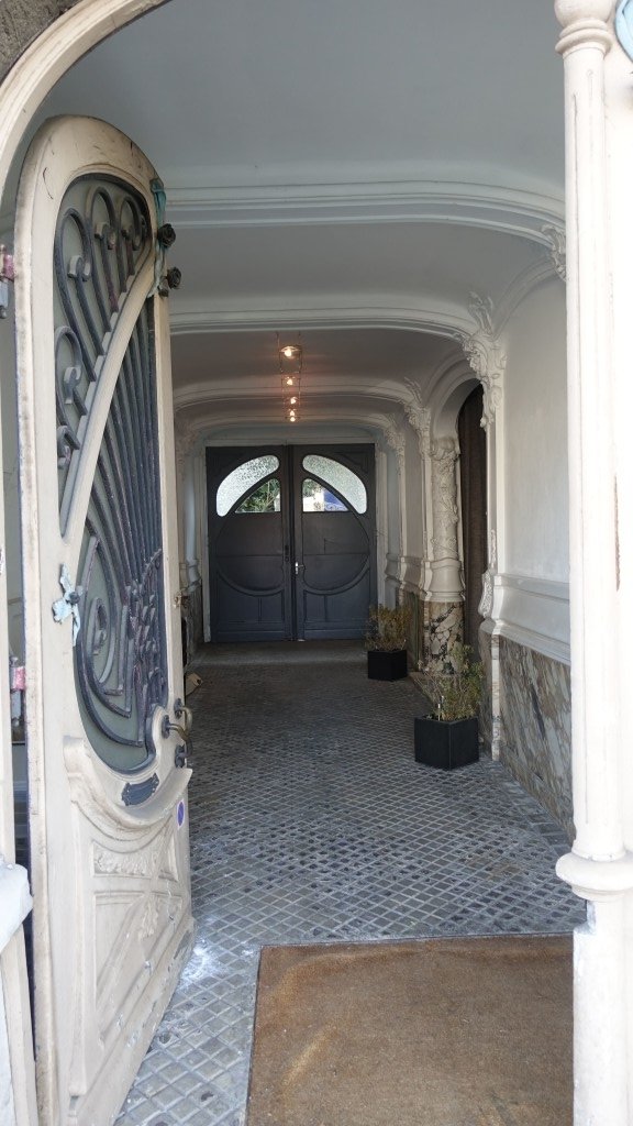 - Au RDC: entrée majestueuse avec présence de nombreux détails sur les murs style Art Nouveau. Marbre présent sur les murs et le sol. Hall d'accueil et pied de l'escalier en marbre également. Menuiseries d'époque style Art Nouveau