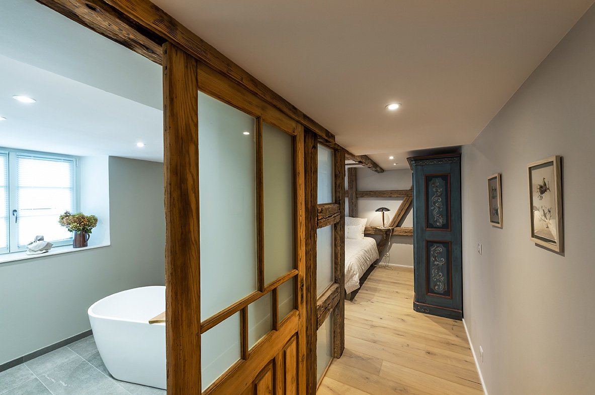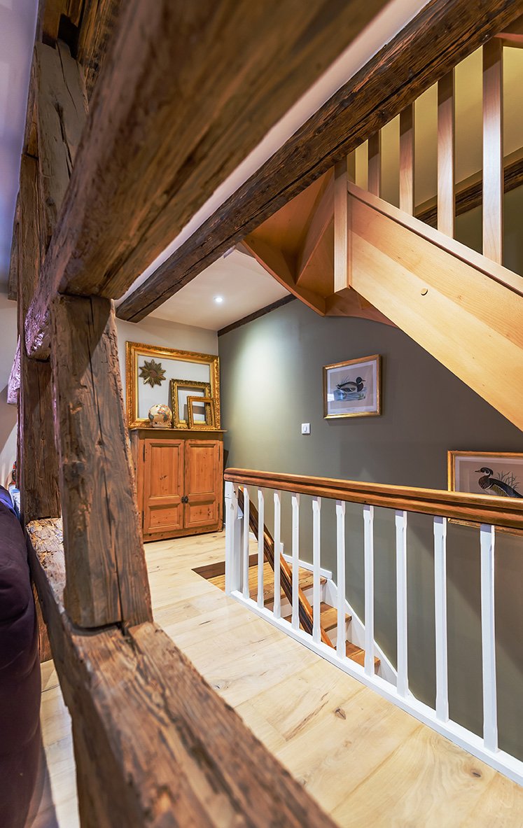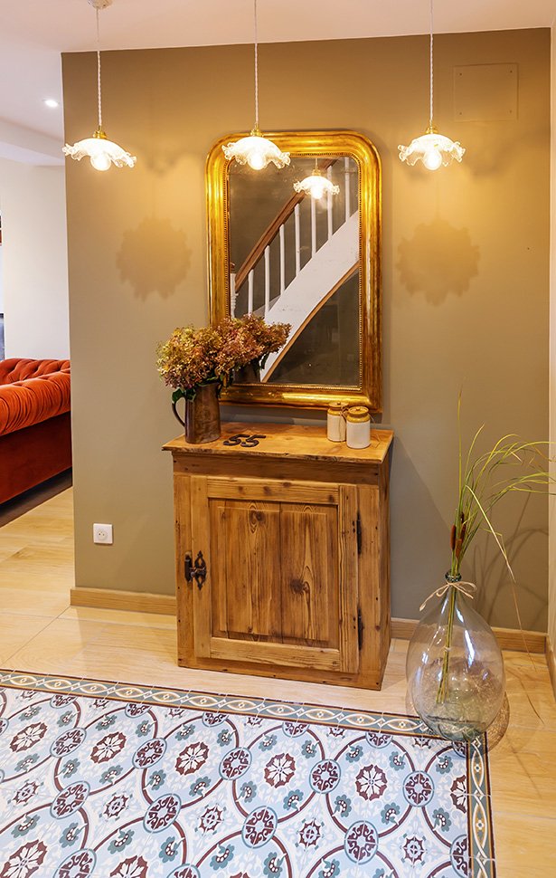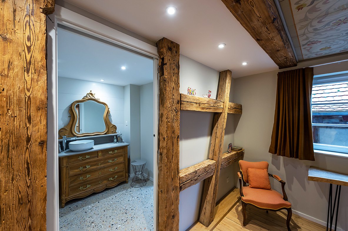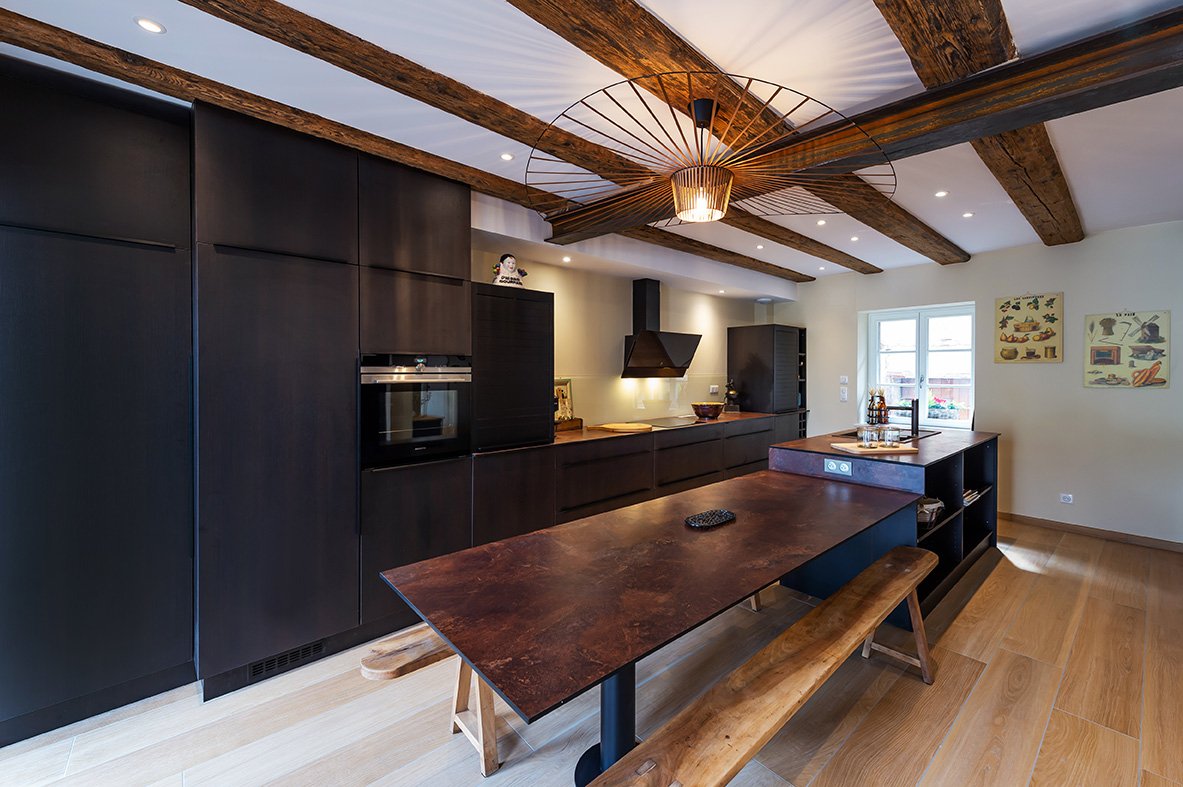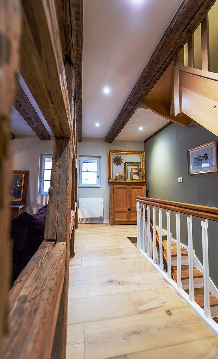 - rdc : espace ouvert avec salon et grande cuisine et cheminée moderne à bois