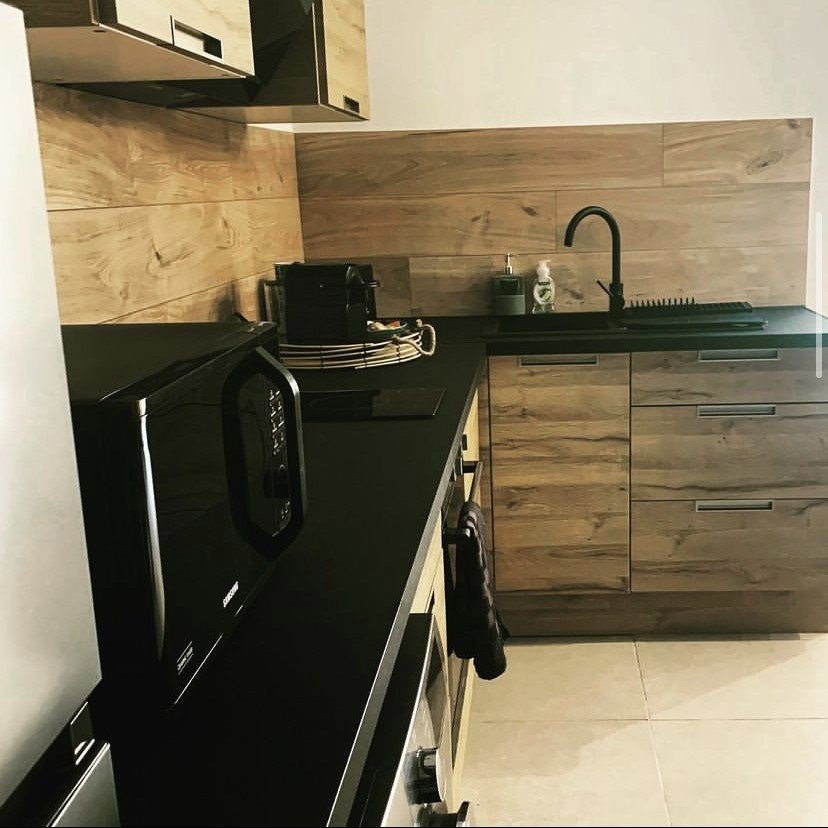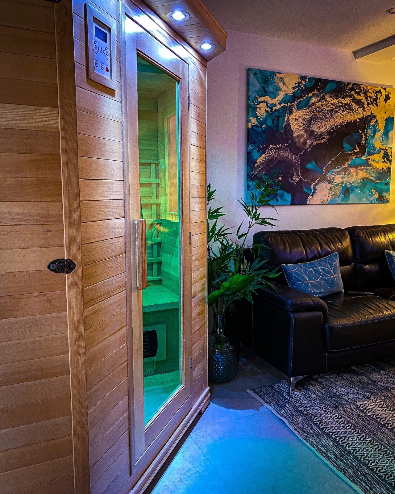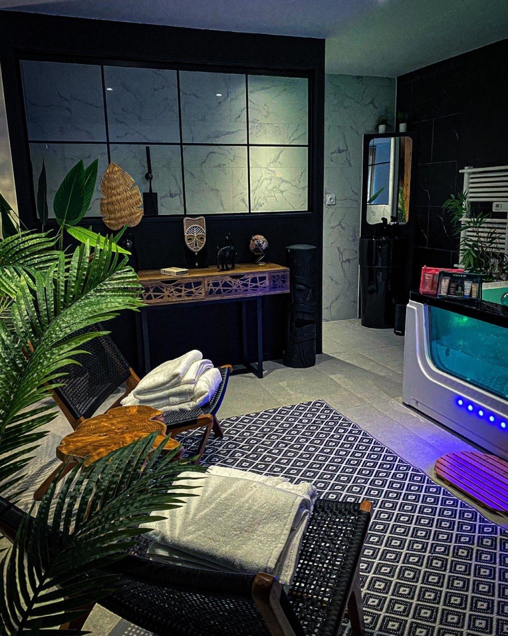 Au RDC, une grande pièce ouverte comprenant une cuisine américaine, un salon avec sauna, une salle de bain ouverte avec balnéothérapie et douche italienne vitrée, une cave à vin