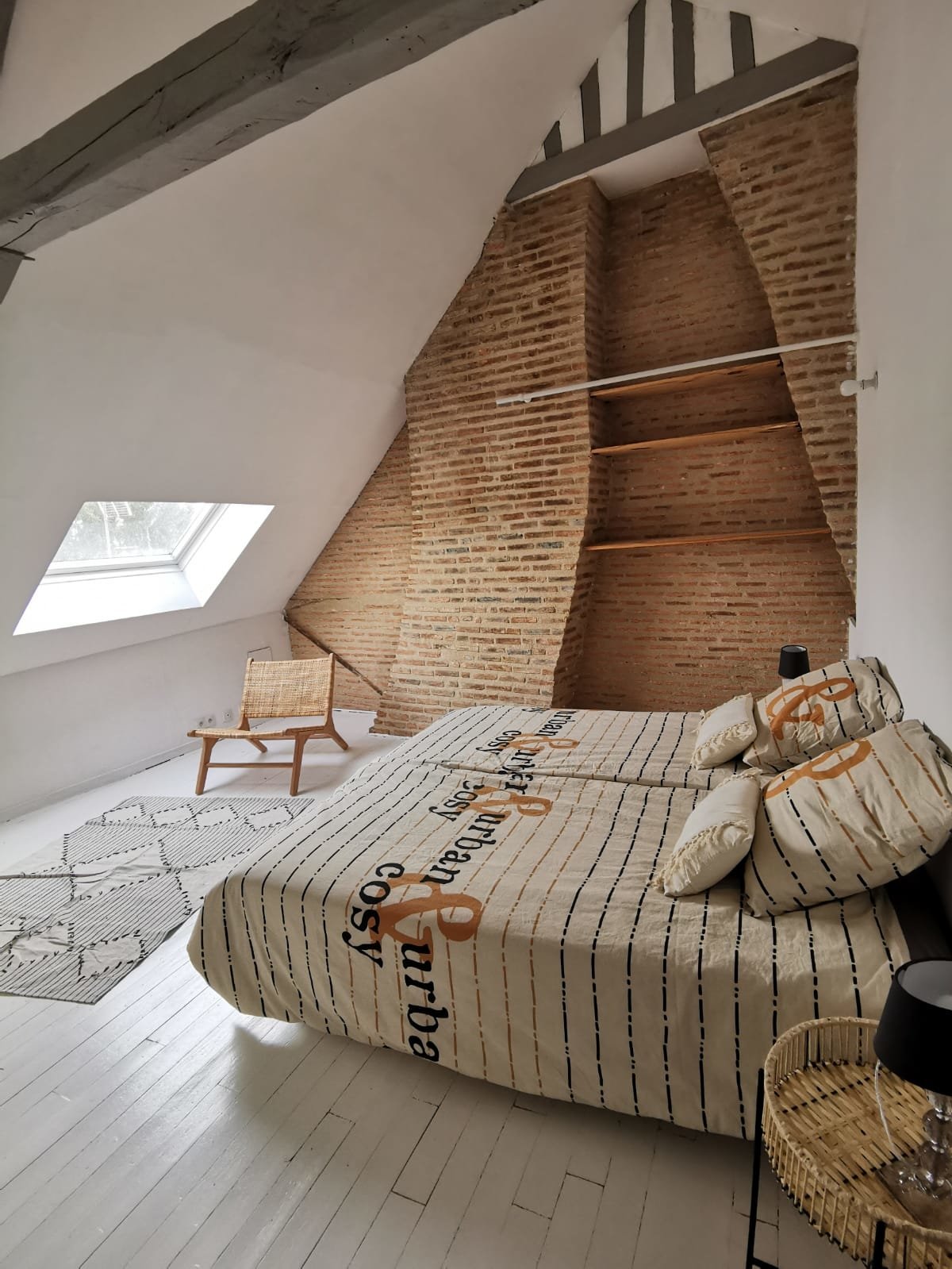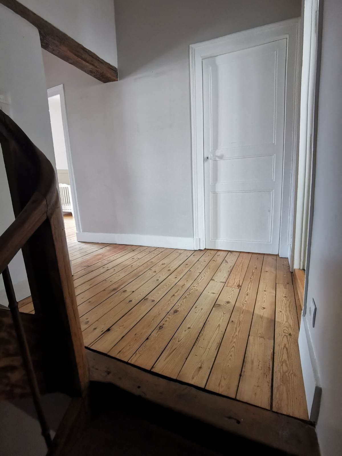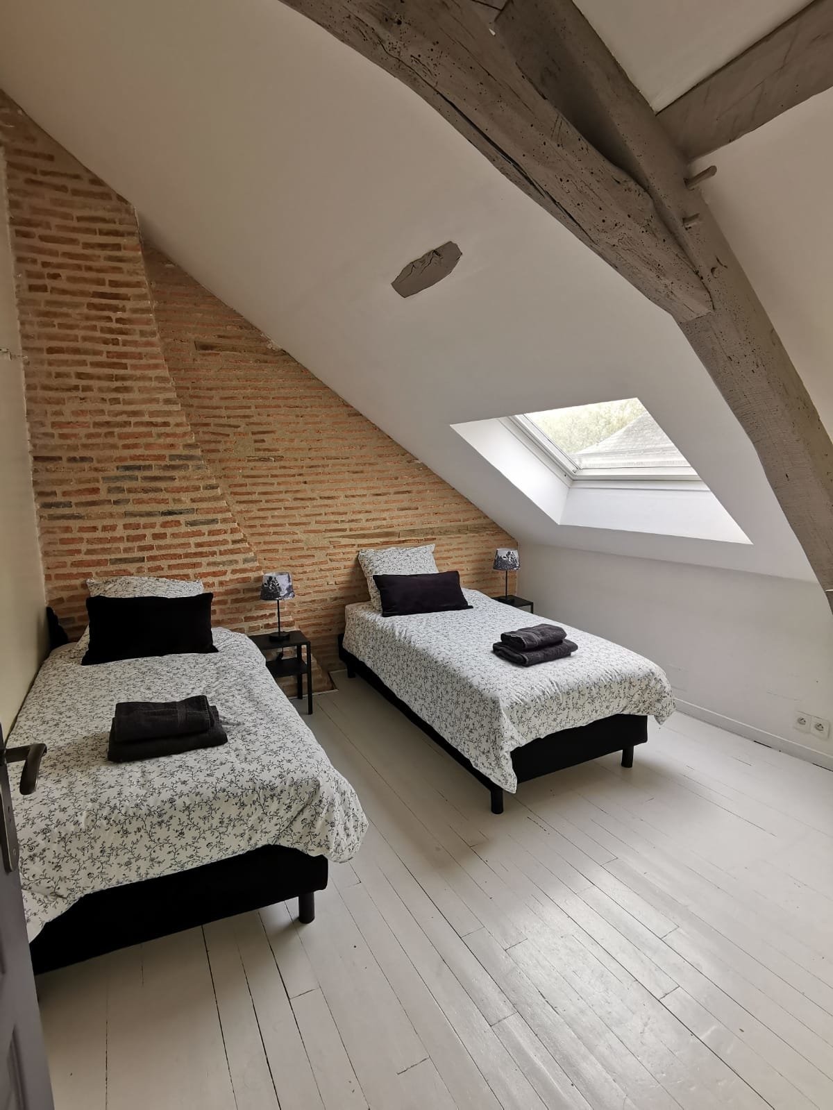 - 3 grandes chambres mansardées à hauteur d'homme, poutres apparentes, grand velux plancher bois peint blanc,