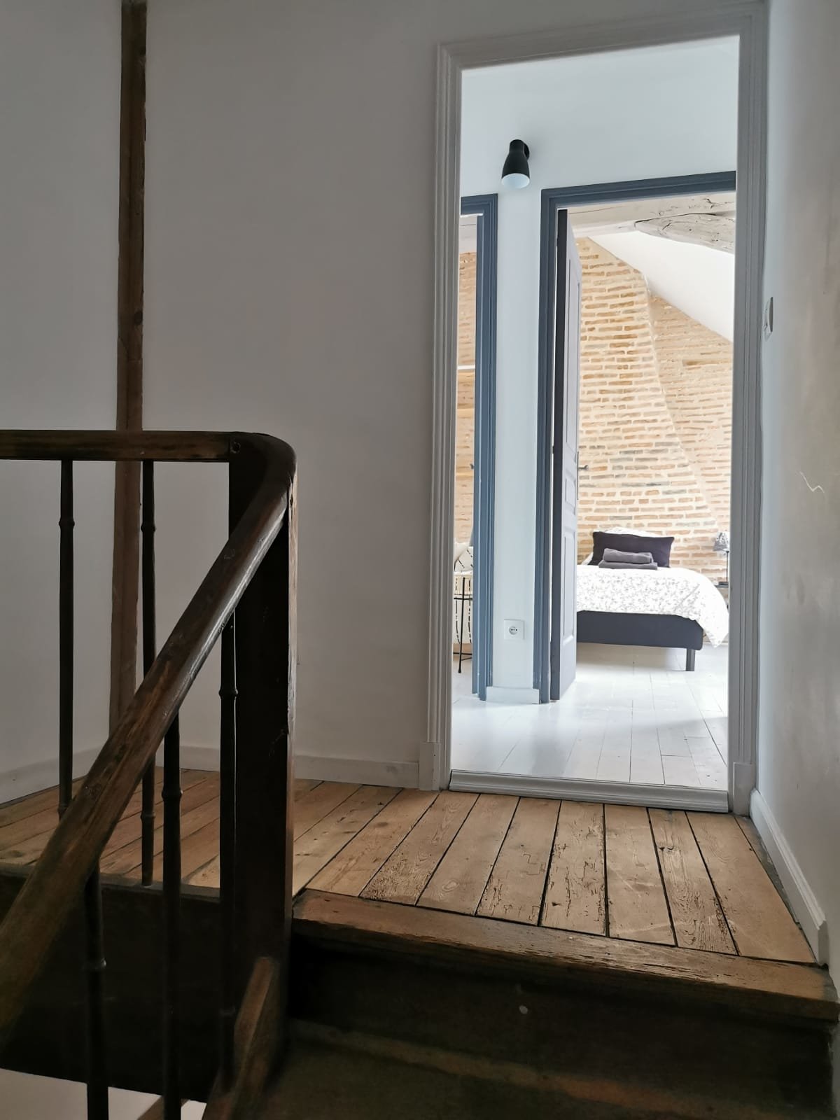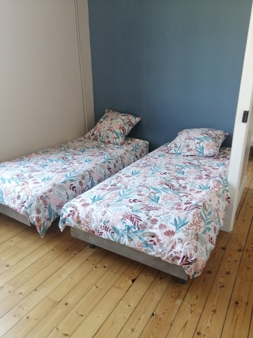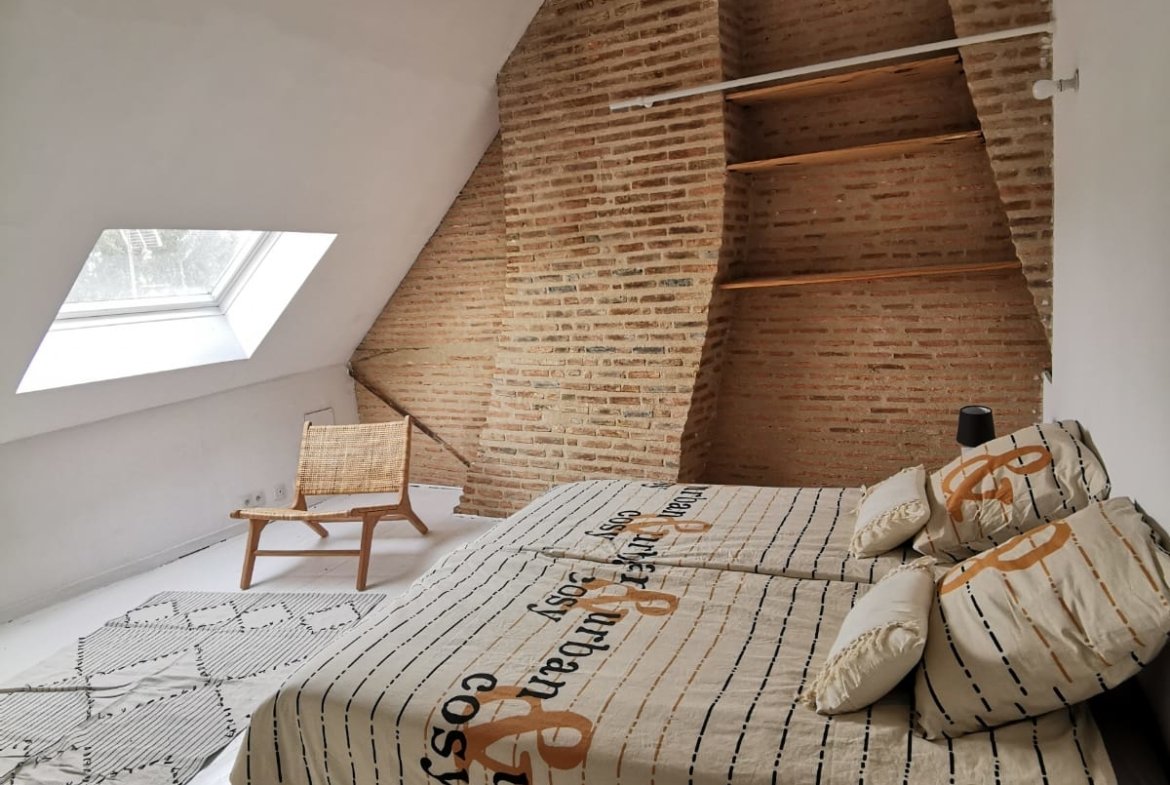- 3 grandes chambres mansardées à hauteur d'homme, poutres apparentes, grand velux plancher bois peint blanc,