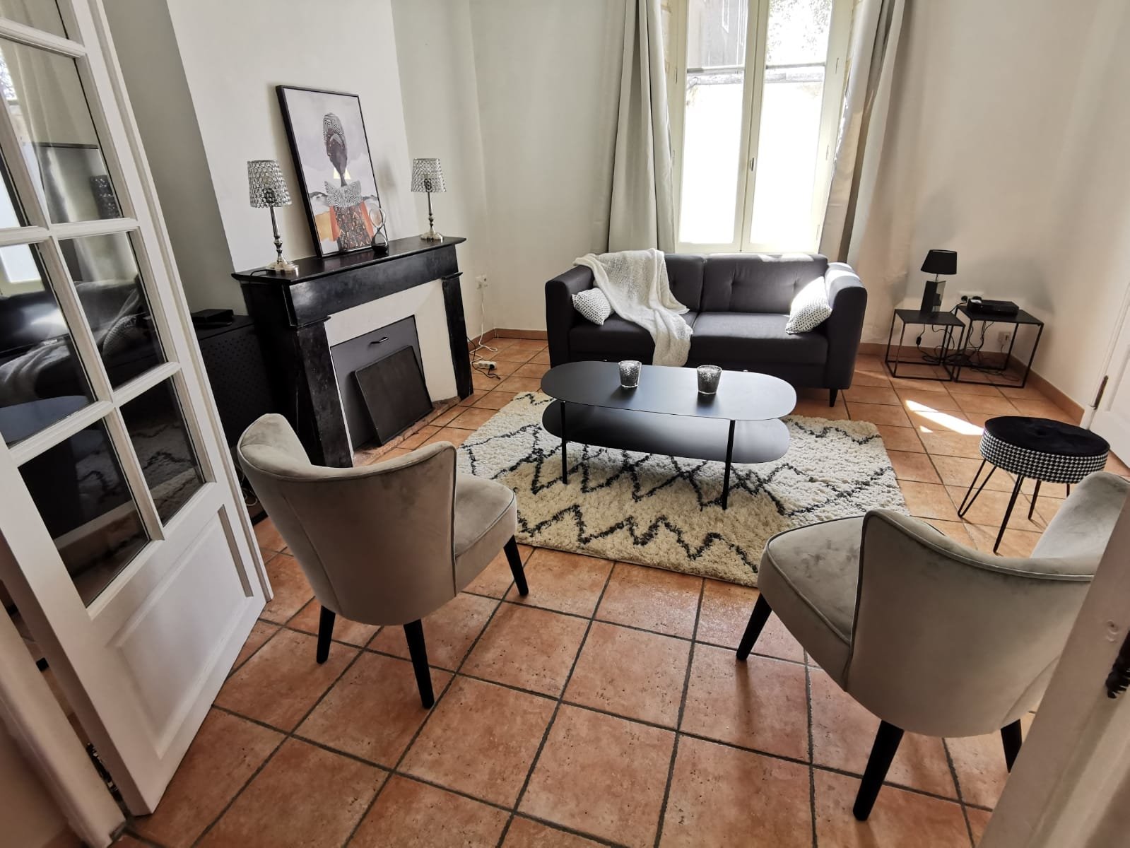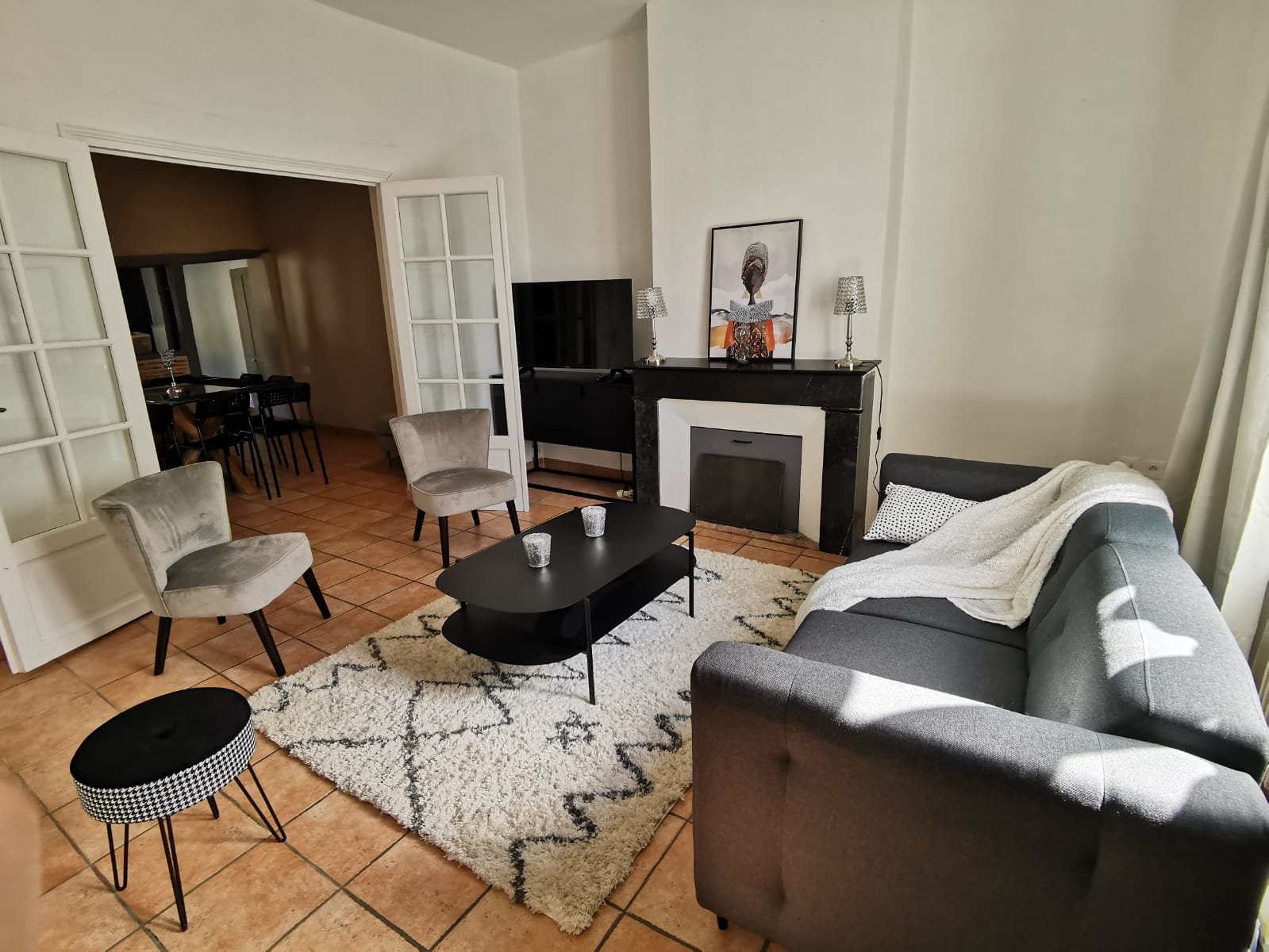 - un salon avec cheminée et carrelage,